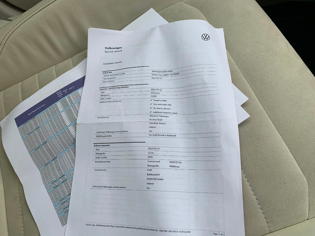Just Arrived. This 2019 Volkswagen Passat 2.0 Tdi Highline Estate. Full Documented Service history and No Expense was ever spared. There's an Excel Spreadsheet available detailing every single spend to date. One previous Irish owner. 07/27 NCT and €200 Road Tax per Annum. A dream to drive with VW reliability. Very smooth on the road and a car not to be missed. The Highline comes with a host of extras. Half Alcantara/Leather Seats, Sat Nav, Reverse Camera, Heated Seats, Upgraded Alloy Wheels, Privacy Glass, Electric Tailgate, Multi Functional Steering Wheel, Cruise Control, Bluetooth, Apple CarPlay/Android Auto and Remote Central Locking are all standard just to mention a few. Bluetooth,CD Player,Centre Armrest,Climate Control,Cruise Control,Electric Seats,Electric Windows,Electronic handbrake,Folding rear seats,Heated Seats,Air Conditioning,Central Locking,EBD,Fog Lamps,Parking Sensors,Remote Central Locking,Traction Control,Brake Assist System,Alloy Wheels,Privacy Glass,Heated Front Seats,Multi-Function Steering Wheel,Sat Nav,Stop/Start Button,Automatic Wipers,Daytime Running Lights,Hill-Start Assist