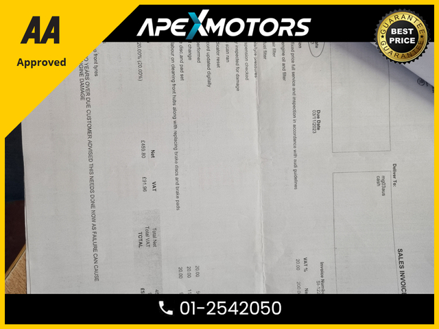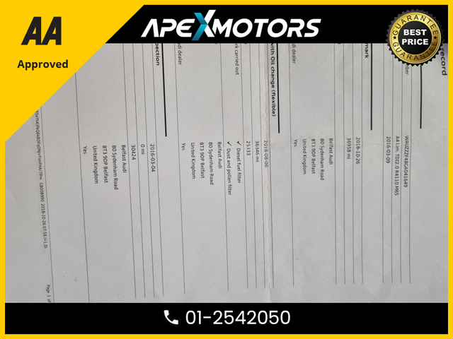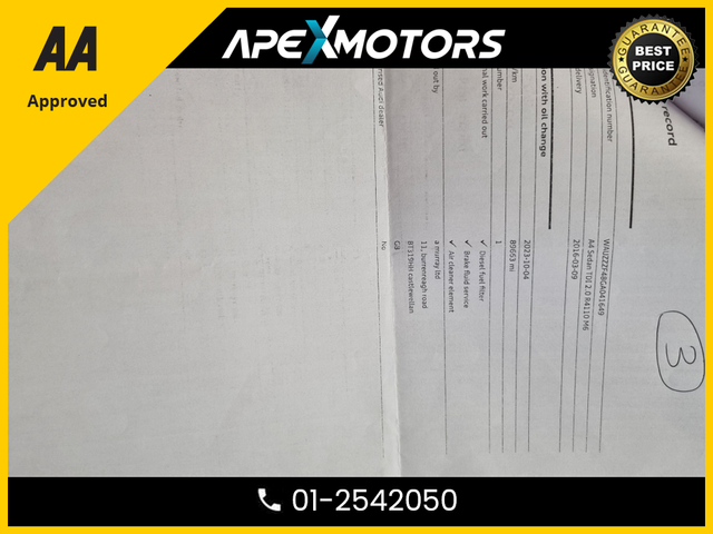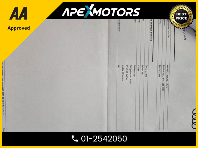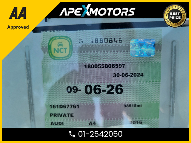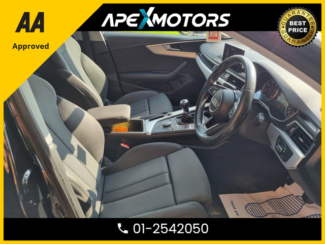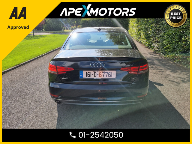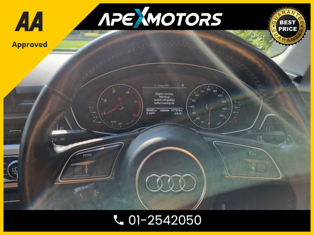 * FINANCE ARRANGED * 2.0 TDI SE ULTRA 150PS 4DR * AA APPROVED * 101 SAFETY CHECKLIST * 12-MONTH ROADSIDE ASSIST * IMMACULATE * LOW LOW MILES * 2-KEYS * NEW NCT JUN-26 * LOW TAX * STAMPED SERVICE HISTORY * ONE VERY CAREFUL OWNER * CARTELL HISTORY CHECKED * FULLY SERVICED * TRADE IN WELCOME * www.apexmotors.ie * CALL 01-2542050 or * WHATTSAPP 087-18-777-81 * WE ARE AN *AA* APPROVED USED CAR DEALERSHIP * ALL CARS GO THROUGH *AA APPROVED* 101 POINT SAFETY CHECKLIST * EXCESS 250 VEHICLES IN STOCK * ALL CARS IN FIRST CLASS CONDITION INSIDE & OUT * ALL VEHICLES ARE NCT TESTED, SERVICED, PROFESSIONALLY VALETED * COMPREHENSIVE AND EXTENDED WARRANTY AVAILABLE * CARTELL DOCUMENTED VERIFICATION * NATIONWIDE DELIVERY AVAILABLE * LOCATED -- EXIT-6 M50 (EIRCODE A86 YC84) * PLEASE CALL OUR SALES TEAM TODAY 01-2542050 or WHATTSAPP 087-1877781 * MON-FRI 2-6PM (Morning by appointment) and ALL DAY SAT 9-5PM * www.ApeXmotors.ie * Because we value your Business.. Voice control system Stop/start button Service interval indicator Electro-mechanical PAS Auto boot lid opening Audi Pre sense collision avoidance Audi drive select MMI radio plus with CD player DAB digital radio module Aux input 2 USB ports Titan black radiator grille with chrome inlay Rear diffuser in Titan black LED daytime running lights Headlight range control Electric rear windows Electric front windows Electric adjustable heated door mirrors Chrome rolled exhaust Body colour door mirrors Body colour bumpers Automatic headlights automatic windscreen wipers Auto dimming rear view mirror Acoustic windscreen Top tether anchor plate for isofix child seat Split folding rear seats Rear headrests Reach rake adjustable steering column Jack and tool kit Isofix child seat preparation for front passenger/outer rear seats inc passenger airbag deactivation Front/rear floor mats Front centre armrest with 12v socket Aluminium door sill trims 3 zone climate control Warning triangle Tyre pressure monitoring system Traction control Seatbelt warning Front side airbags Front seatbelt pretensioners load limiters Front head airbags First aid kit ESP Electromechanical parking brake Adaptive driver and front passenger airbags ABS/EBD 3 point seatbelts on all rear seats Thatcham category 1 alarm immobiliser Remote central locking Locking wheel bolts Low rolling resistance tyres Low rolling resistance tyres Exterior aluminium pack - A4 Full Service History, Perfect working order, Price Or Near Offer, 3 Month Warranty, 6 Month Warranty, 12 Month Warranty, Trade in accepted, Air Conditioning, Central Locking, CD Player, Immaculate condition, Electric Windows, Airbag, Alloy Wheels, Cruise Control, Electric Mirrors, Fog Lamps, Immobiliser, Leather Upholstery, Full Leather, Half Leather, Privacy Glass, Automatic Wipers, Automatic Lights, Centre Armrest, Luggage Cover, Multi-function steering wheel, Climate Control, Traction Control, Metallic Paint, Multiple Air Bags, Anti-Theft System, Parking Sensors, Bluetooth, Remote Central Locking, EBD, Electronic handbrake, Six speed transmission, Isofix, Hill holder, Roadside assistance, History Checked, Finance Checked, Heated Front Seats, Electro Chrome Rear View Mirror, Active Safety Braking / City Brake / Collision Alert, Stop/Start Button, Dual Zone Climate Control, Daytime Running Lights, 2 Keys, Main Dealer Service History, External Devices Connectivity, Cup holders, Remote boot/hatch/rear door release, Stability control