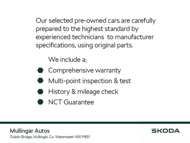 Contact Shane @ 087 2515555 Trade ins welcome - Finance available. At Mullingar Autos, our Used Cars come with: Full vehicle history check. Comprehensive Warranty. Maintenance up to date. Competitive finance available. Outstanding Aftersales care. Want finance info, to view a video of this vehicle or reserve it now – Simply visit www.mullingarautos.ie. Alternatively, call us now on 044 934 8755 or visit us on the Dublin Bridge, Mullingar, Co. Westmeath, N91 P651.