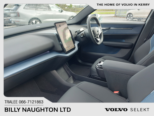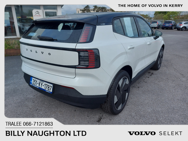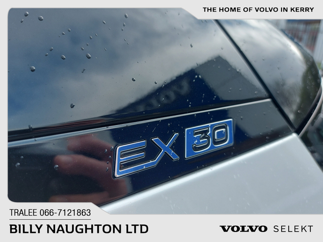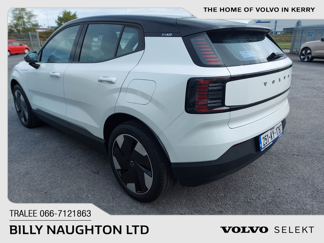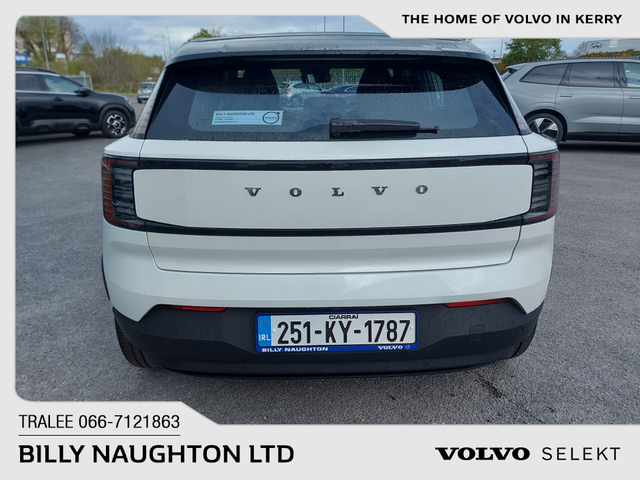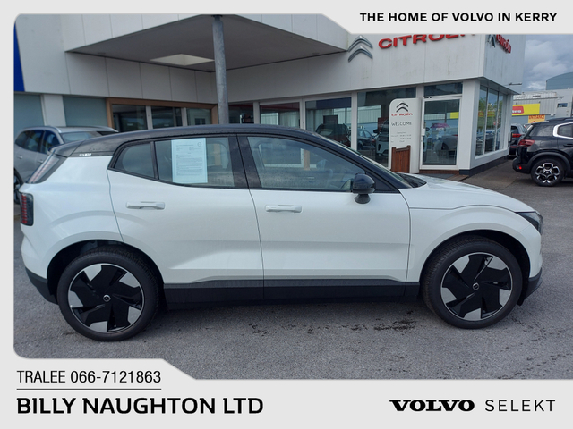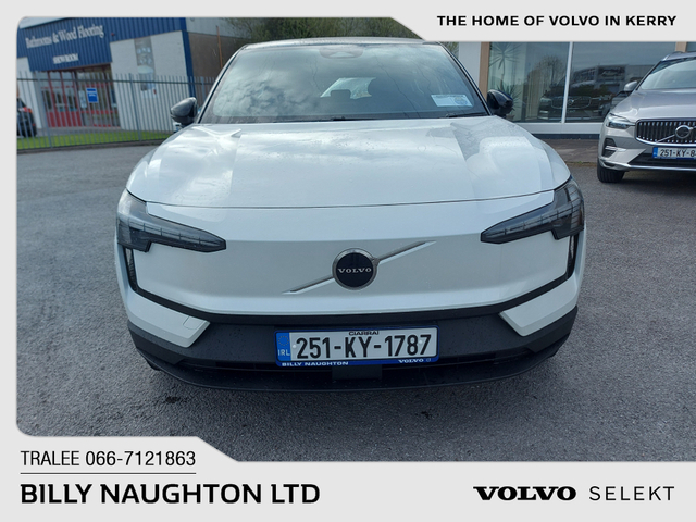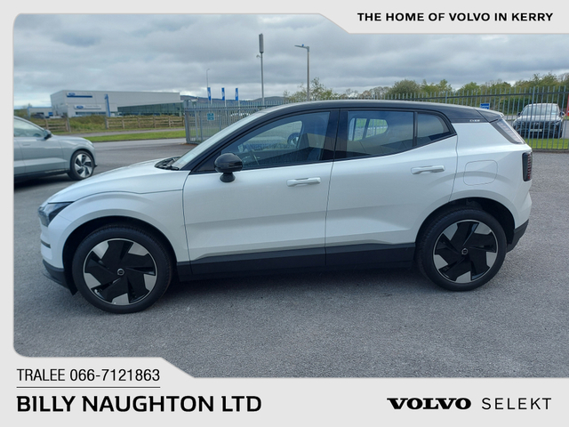 From only €368.19 P/M* €368.19 P/M over 40 Months is based on a deposit/trade in of €15,000 and a final payment of €17,180. Volvo Ex30 Plus Extended Range Crystal White Paint Indigo Interior 19inch glossy black diamond cut alloys Heated Front Seats and Steering Wheel Up to 476km battery range Tech & Sound Google services Harman Kardon Premium Sound Digital Audio Broadcasting (DAB) 5G capability Wireless phone charging Front and rear USBC ports Wireless Apple CarPlay Volvo EX30 App Over-the-air updates Drivers Support Pilot Assist Lane change assist Reversing Camera Led Headlights with active high beam Auto-dimmed inner and door mirrors Rain Sensor Key Card Entry For more information please call our sales team on 066 712 1863 Central Locking, Electric Windows, Airbag, Cruise Control, Rear Spoiler, Centre Armrest, Multi-function steering wheel, Satellite Navigation, Traction Control, Anti-Theft System, Parking Sensors, Bluetooth, Isofix, Apple Car Play, Active Safety Braking / City Brake / Collision Alert, External Devices Connectivity, Cup holders, Stability control