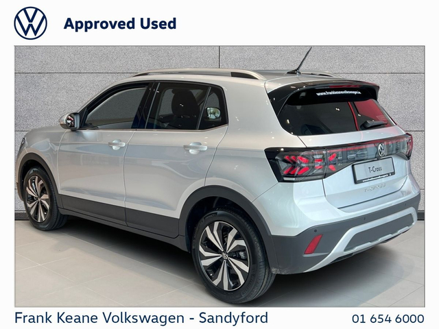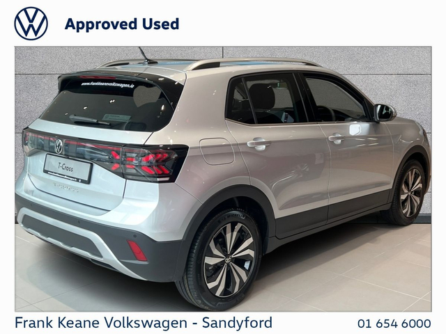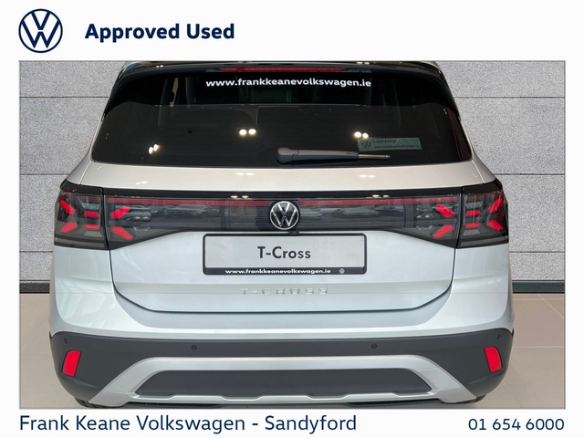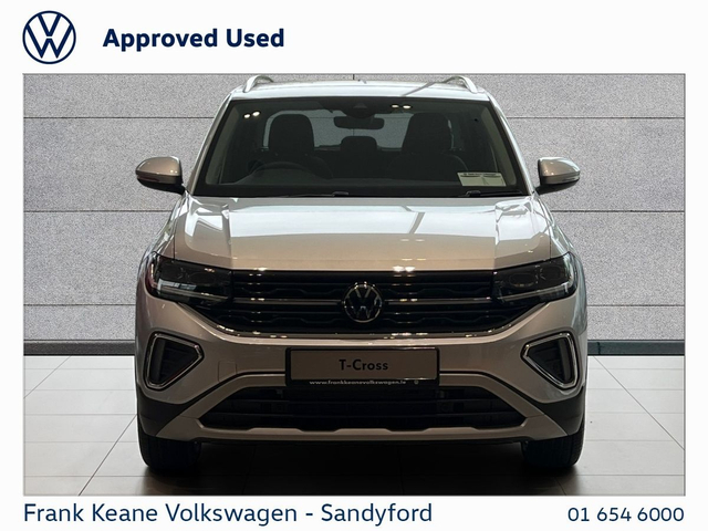Experience complete confidence with the Frank Keane Volkswagen Optional Pre-Owned Vehicle Protection Pack — including a 24-month warranty, 3-year Return to Invoice (RTI) investment protection, and 3-year paint, glass, and upholstery protection with LifeShine. Premium cover, expertly designed to protect your vehicle and your investment. To Learn more, speak to one of our Sales Team in Frank Keane Volkswagen Sandyford today. The 2025 Volkswagen T-Cross Style 1.0 TSI 116HP DSG Automatic is a compact SUV that combines practicality with efficient performance. It is powered by a 1.0-liter turbocharged three-cylinder petrol engine, producing 116 horsepower and 200 Nm of torque. This engine is paired with a 7-speed dual-clutch (DSG) automatic transmission, enabling the vehicle to accelerate from 0 to 100 km/h in approximately 10.3 seconds and achieve a top speed of around 193 km/h*Exact Mileage To Be Confirmed* We do not stock many used cars. This car is being traded in to us and we are advertising it at a "PRE-SALES" price. When the vehicle arrives into our stock (unless it's pre-sold) we only sell to a network of motor dealers. This is your opportunity to reserve this vehicle at this price now, subject to seeing it. Please contact our Sales Team today for a Personalised Video of this Car, Digital Part Exchange Valuations and Tailored Funding Options to meet your needs on 01-6546000 Here at Frank Keane Volkswagen Sandyford, we ensure all our used vehicles are prepared to the highest of standards and all used cars come with a minimum of 12 months warranty and get a 120-point multi point pre-sale service check with no expense spared to ensure owner confidence. • ABS • Driver Airbag • Passenger Airbag • Side Airbag • Child Locks • Daytime Running Lights • DSG • Flat Tyre Indicator • ISO Fix • Multiple Airbags • Side Impact Protection • Immobilizer • Centralised locking • Cruise Control • Hill Hold • Parking Assistance • Power Steering • Stop and Start System • Tiptronic • Adjustable Steering Column • Air Conditioning • Armrest • Bluetooth Phone • Climate Control • Dual Climate-Control • Mobile Device Interface (media-in) • Multi-Function Steering Wheel • Radio/CD/MP3 • Split Fold Rear Seats • Touchscreen Stereo • USB • Alloy Wheels • Rear View Camera