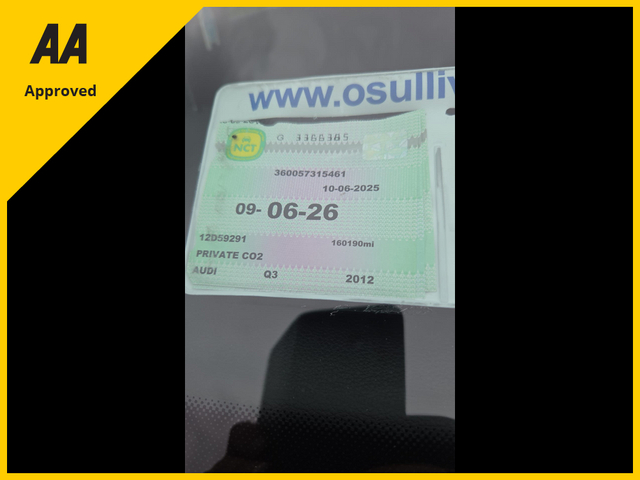 AUDI Q3 / 2012 / 2.0 DIESEL / MANUAL 2.0 TDI S LINE 140PS 5DR OUR CARS CAN BE SEEN IN 2 GREAT LOCATIONS Tolka Valley Business Park Unit 9. Ballyboggan Rd. D11 or Birr Road Roscrea CO TIPPERARY Get your new car today Finance arranged in 2 hours * Warranty on all Vehicles * Full warranted Mileage Service history O Sullivan Motors Why not apply for finance No deposit! 100% loans! CALL US TODAY ! All our vehicles are checked with cartell.ie O'Sullivan motors quality vehicles at affordable prices ! If you cant make it to us during business hours ask for an appointment we'll be glad to help! O'Sullivan Motors Is A Family Run Business O'Sullivan Motors are a SIMI Approved Dealer www.osullivanmotorsdublin.ie Thanks For looking Central Locking, Electric Windows, Airbag, Fog Lamps, Rear Spoiler, Centre Armrest, Multi-function steering wheel, Roof Rails, Traction Control, Metallic Paint, Anti-Theft System, Parking Sensors, Bluetooth, EBD, Isofix, Active Safety Braking / City Brake / Collision Alert, Stop/Start Button, External Devices Connectivity, Cup holders, Remote boot/hatch/rear door release, Stability control