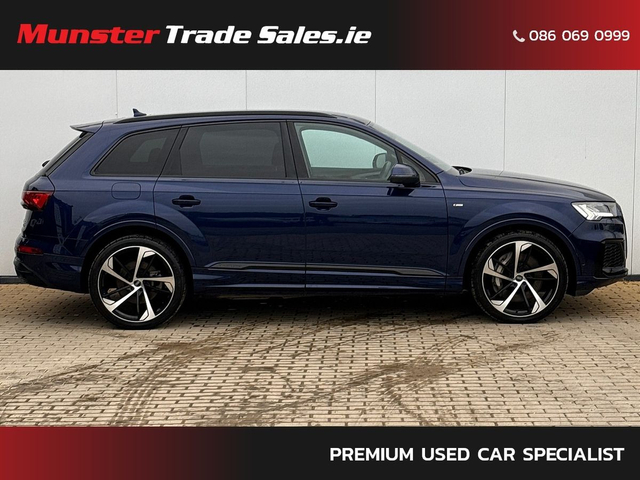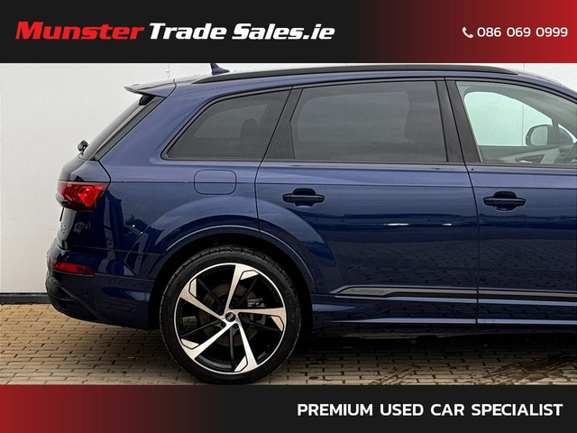 2022 Audi Q7 3.0 TFSI e quattro S line – Plug-in Hybrid Navarra Blue Metallic | Valcona Leather Interior | 381PS | Automatic The Audi Q7 55 TFSI e quattro represents the perfect balance of luxury, space, and advanced hybrid technology. Finished in Navarra Blue Metallic with a premium Black Valcona leather interior, this model combines a powerful 3.0-litre V6 petrol engine with plug-in hybrid efficiency, delivering a total system output of 381PS through Audi’s legendary quattro all-wheel drive. Petrol Performance + Plug-In Hybrid Efficiency = The best of both worlds. Key Features • 3.0 TFSI V6 Petrol Plug-in Hybrid (381PS / 280kW) • Tiptronic Automatic Transmission • quattro All-Wheel Drive with Self-Locking Centre Differential • Adaptive Air Suspension for Comfort & Dynamics • Drive Select with Multiple Modes • Acoustic Vehicle Alert System S line Package • Full S line Exterior Styling with Painted Bumpers • S line Sports Suspension • Sport Front Seats with Valcona Leather & S Embossing • Illuminated Aluminium Door Sills with S Logo • 20” 5-Spoke Turbine Alloys (285/45 R20) Interior & Comfort • Electrically Adjustable Front Seats with Driver Memory • Heated Front Seats with 4-Way Lumbar Support • Ambient Lighting Package (Multi-Colour) • Black Headliner • Matt Brushed Aluminium Inlays • 3-Zone Deluxe Automatic Climate Control • Power-Operated Tailgate • Roof Rails in Aluminium • Privacy Glass & Heat-Reflecting Acoustic Glass Technology & Infotainment • Audi Virtual Cockpit Digital Dash • MMI Navigation Plus with MMI Touch Response • Audi Smartphone Interface (CarPlay / Android Auto) • Audi Music Interface + DAB Digital Radio • Audi Sound System with Bluetooth Connectivity • Reversing Camera + Parking System Plus (360° Display) Driver Assistance & Safety • Adaptive Cruise Control with Speed Limiter • Lane Departure Warning • Pre Sense Front • Camera-Based Traffic Sign Recognition • Hold Assist • ISOFIX Child Seat Mounting (Front & Rear) • Alarm System & Anti-Theft Protection • Airbags: Front, Side, Curtain Systems Vehicle Details • Year: 2022 • Engine: 3.0 TFSI V6 Plug-in Hybrid (381PS System Output) • Transmission: Tiptronic Automatic • Drive: quattro All-Wheel Drive • Colour: Navarra Blue Metallic • Interior: Valcona Leather with S Embossing • Mileage: 61,000 Miles/100,000 Kms. • Full History Checked Price: 61,000 Finance Options Available | Comprehensive Warranty Included Fully Valeted & Prepared to the Highest Standards Available now at Munster Trade Sales munstertradesales.ie • Full vehicle Service & inspection • Professionally valeted & Detailed • Car History Checked • Finance Available • Full Service History • 2 Remote keys