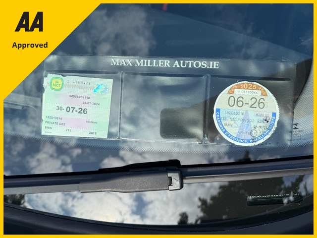 Welcome to Max Miller Autos. All our vehicles come serviced and with a warranty. Finance can be arranged. All major debit/credit accepted. Call owner Max on 08626 02889 or Head of Sales Daragh on 0877961810 www.maxmillerautos.ie , 182 BMW 2 Series 218i Sport , 1.5 Auto Petrol, Full Leather , Front And Rear Parking Senors, Full Valet, Nct07/26, Tax06/26, Excellent Overall Condition Full Service History, 6 Month Warranty, Trade in accepted, Air Conditioning, Central Locking, Immaculate condition, Electric Windows, Airbag, Alarm, Alloy Wheels, Electric Mirrors, Fog Lamps, Immobiliser, Full Leather, Automatic Wipers, Automatic Lights, Centre Armrest, Multi-function steering wheel, Satellite Navigation, Traction Control, Multiple Air Bags, Anti-Theft System, Parking Sensors, Bluetooth, Remote Central Locking, EBD, Folding rear seats, Isofix, Hill holder, Front Parking Sensors, Lane Departure Warning, Active Safety Braking / City Brake / Collision Alert, Stop/Start Button, Daytime Running Lights, 2 Keys, External Devices Connectivity, Cup holders, Remote boot/hatch/rear door release, Stability control