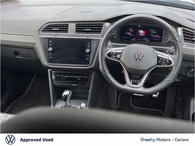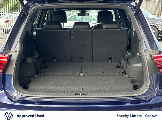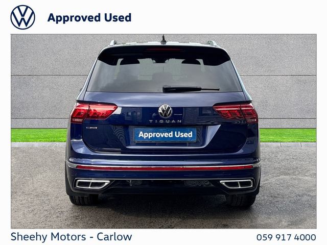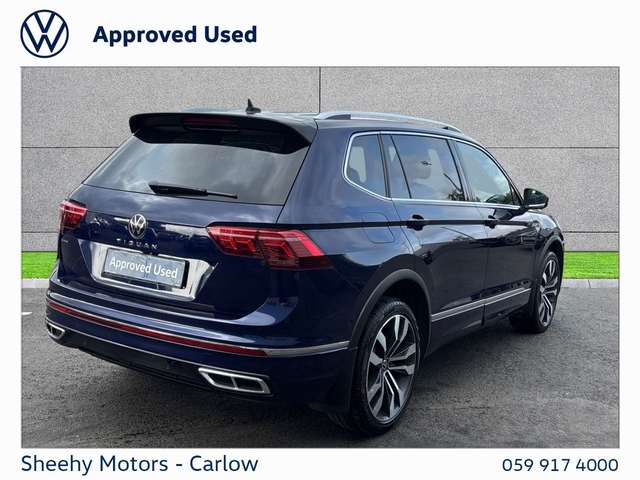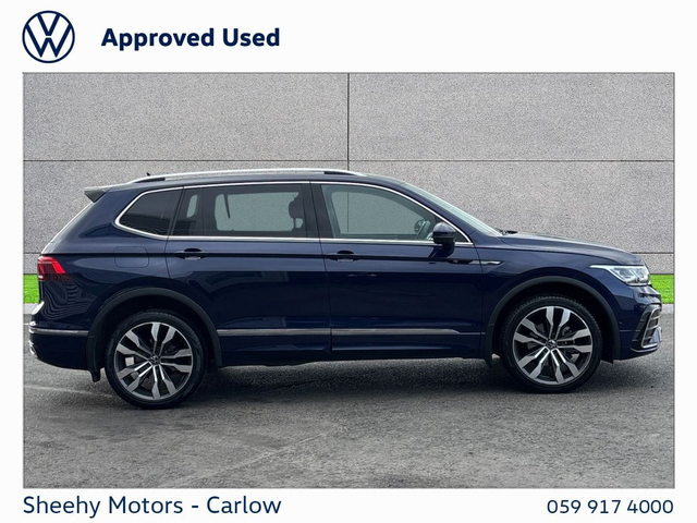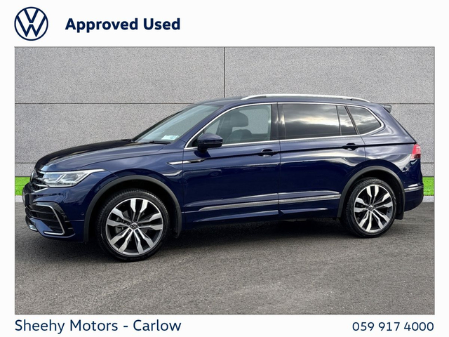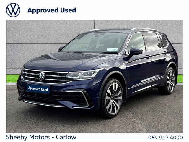 Tiguan Allspace R-Line DSG 2.0 TDI 150BHP in Atlantic Blue Metallic. Contact our sales team on 05991 74000 or call Gearoid on 087 2302050 . Parking Assistance, Satellite Navigation, Bluetooth Phone, Dual Climate-Control, Heated Seats, Leather Multi-functional Steering Wheel, 20" Alloys, Chrome Package, Privacy Glass, R-Line, Adaptive Cruise Control, LED Headlights, Apple Car Play / Android Auto, Rear Camera
