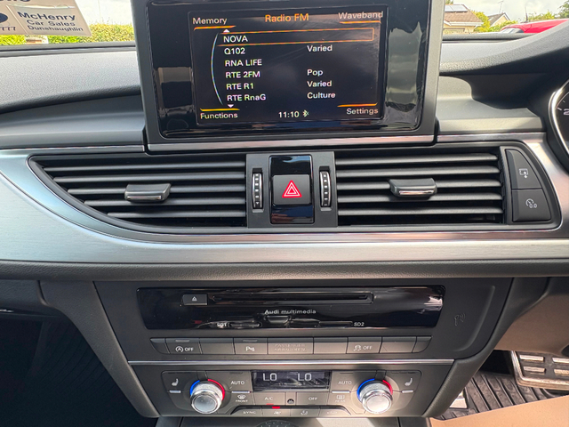 Call Barry-John on 0863594983 or 01 8017777 to find out more about this stunning Audi A6 S-Line, We can offer a click and deliver or click and collect service if a customer wishes, This car comes fully serviced, warrantied, trade ins accepted and finance can be arranged. We are a SIMI approved dealership who specializes in premium cars and we are located just 10 minutes from Blanchardstown Shopping Centre just off the M3. Our Eircode is A85 DK15. We are located on Dunshaughlin Main street on the Navan side of the village. Bluetooth,CD Player,Centre Armrest,Climate Control,Cruise Control,Electric Mirrors,Electric Windows,Electronic handbrake,Folding rear seats,Six speed transmission,Air Conditioning,Anti-Theft System,Central Locking,EBD,Multiple Air Bags,Parking Sensors,Remote Central Locking,Traction Control,Brake Assist System,Alloy Wheels,Metallic Paint,All-Leather Seats,Multi-Function Steering Wheel,Sat Nav,Selectable Drive Mode,Stop/Start Button,Automatic Lights,Automatic Wipers,Daytime Running Lights,Engine Immobiliser,Hill-Start Assist,Isofix Points,Leather Upholstery,USB Connection,AUX Connection,Cup Holders