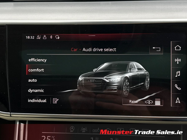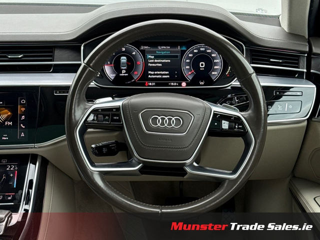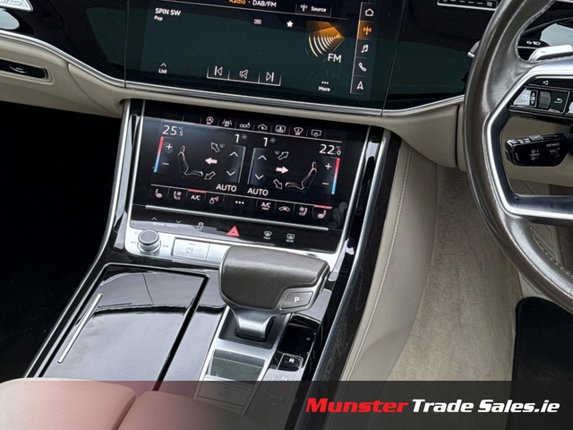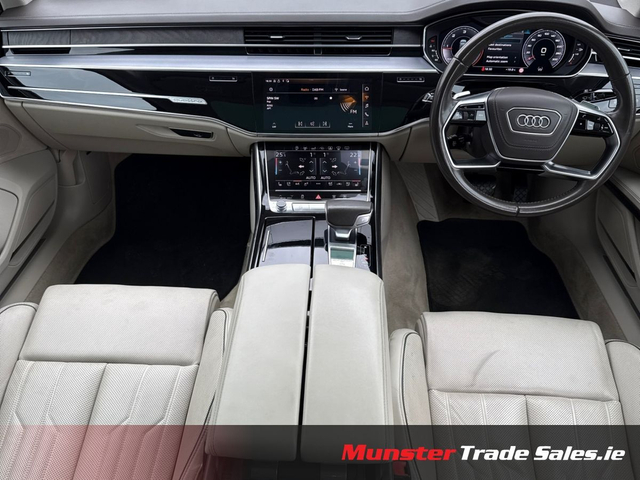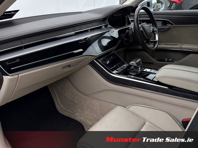 2018 Audi A8 3.0 TDI V6 quattro Tiptronic Floret Silver Metallic | Valcona Leather Interior | 286PS The Audi A8 is Audi’s flagship luxury saloon – a showcase of advanced engineering, refined design, and cutting-edge technology. This example, finished in Floret Silver Metallic with a premium Valcona leather interior in Mother-of-Pearl Beige, is powered by the 3.0 TDI V6 diesel (286PS) with quattro all-wheel drive and mild-hybrid efficiency, delivering effortless performance with executive comfort. Key Features • 3.0 TDI V6 Diesel Engine (286PS / 210kW) • 8-Speed Tiptronic Automatic Transmission • Mild Hybrid Technology (48V MHEV) • quattro Permanent All-Wheel Drive • Adaptive Air Suspension with Dynamic All-Wheel Steering • Electrically Swivelling Towbar Exterior & Lighting • 20” Forged Alloy Y-Spoke Wheels (265/40 R20) • HD Matrix LED Headlights with Dynamic Indicators • LED Rear Combination Lamps with Dynamic Turn Signal • Acoustic & Heat-Reflecting Windscreen • Panoramic Glass Sunroof • Chrome Exterior Styling Package • Privacy Glass (Rear & Side Windows) Interior & Comfort • Valcona Leather Interior (Mother-of-Pearl Beige with Sapwood Brown Trim) • Comfort Climate Seats with Heating, Ventilation & Massage • Electrically Adjustable Front Seats with Memory Function • Heated Rear Seats with Comfort Head Restraints • Electrically Operated Rear & Side Window Sunshades • 4-Zone Automatic Climate Control • Ambient & Contour Lighting Package (Multi-Colour) • Extended Leather Package with Fine Grain Ash Wood Inlays • Power-Operated Boot Lid • Refrigerated Storage in Centre Console Technology & Infotainment • Audi Virtual Cockpit Digital Display • MMI Navigation Plus with Dual Touch Response • Audi Connect Navigation & Infotainment • Audi Phone Box with Wireless Charging & LTE Support • Digital TV Reception with CI+ Pay TV System • Bang & Olufsen Premium 3D Sound System • Rear Seat Remote Control • DVD Drive • DAB Radio • Audi Music Interface • Keyless Comfort Access & Start/Stop Button Driver Assistance & Safety • Audi Pre Sense Front & Rear + Basic • Adaptive Cruise Assist with Traffic Jam Assist • Lane Assist & Lane Change Assist with Exit Warning • 360° Parking Cameras with Parking Aid Plus • Head-Up Display • Cross Traffic Assist Front & Rear • Road Sign Recognition • Active Pedestrian Protection • Alarm System with Anti-Theft Wheel Bolts • ISOFIX Child Seat Mounts (Front & Rear) Vehicle Details • Engine: 3.0 TDI V6 (286PS) • Mild Hybrid • Transmission: 8-Speed Tiptronic Automatic • Drive: quattro All-Wheel Drive • Colour: Floret Silver Metallic • Interior: Valcona Leather, Mother-of-Pearl Beige / Sapwood Brown • Mileage: [Insert] • Irish Car | Full History Checked Finance Available | Comprehensive Warranty Included Fully Inspected & Professionally Valeted Available now at Munster Trade Sales munstertradesales.ie