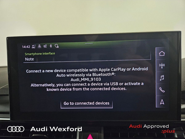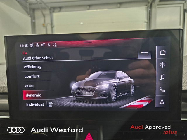 Audi A5 35 TDI 163HP S-Tronic SE Sportback €517pm • Audi Sound System • Bluetooth Interface • Mobile Phone Preparation-Bluetooth • Touchscreen Stereo • Audi Drive Select • Audi Stop/Start • Auto Handbrake • Cruise Control • Alloy Wheels • Metallic Paint • Air Conditioning • Armrest • Button Start-Stop • Electric Mirrors • Electric Windows • Multi-Function Steering Wheel • Onboard Computer • Rake/Reach Adjustable Steering Column • Lumbar Support • ABS • Alarm • Anti-Lock Brake System • Child Locks • Immobilizer • ISO Fix • Reverse Camera • Reversing Sensors • Remote Central Locking • USB • Audi Connect • Audi Smartphone Interface • Keyless Go • Reverse Camera • USB charging ports