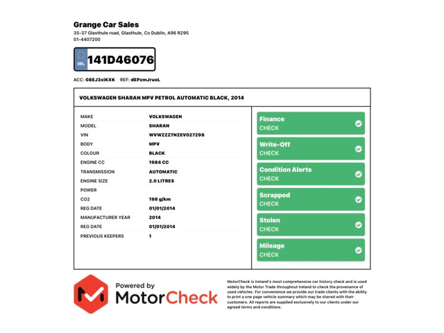 Welcome to Grange Car Sales Ltd. A well established AA Approved Motor Dealership supplying quality affordable used cars nationwide. Please note, viewing on all our vehicles is by appointment only so please call, txt, Watsapp or email in advance to arrange. Just in, lovely high spec example of a 2014 VW Sharan 2.0 TSi Petrol 7 Seater High Line Auto with only 76,000 km, 2 keys and April 2027 nct. Specifications include - Upgraded Alloys - Auto lights / wipers - Full two tone leather interior - Electric heated seats - Power sliding rear doors - Power boot lid - Power folding mirrors - Reversing camera - Parking sensors with park assist - Cruise control - Leather trim multi function wheel - Auto hold hill assist - Rear privacy glass - Rear blinds - Isofix seat fixings - Navigation - Bluetooth - Audio streaming - Voice control - Aircon front and rear - Panoramic glass roof with slide / tilt option - Xenon lights with bend function An excellent high spec, functional and versatile large family vehicle. Vehicle is sold serviced and valeted. Warranty provided on all vehicles sold, regardless of year or mileage along with a full motor history check. Thanks for looking.