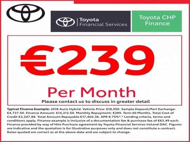 Our Price EUR 20,899. Sale Price EUR 20,399.You Save EUR 500 All Trade In’s Welcome Irish Car – NOT An Import. Annual Road Tax EUR 190 NCT Approved Until July 2027 Fully Serviced In Advance Of Delivery To You. 100 Point Safety Check Completed. Comes With 12 Month Toyota Warranty Supplied Comes With 12 Month Toyota Roadside Assist Supplied Tailor-made Finance Options To Suit Your Needs. Front Electric Windows, Rear Electric Windows, Electric Mirrors, Heated Mirrors, Power Folding Mirrors, Air Conditioned, Alloy Wheels, Cruise Control, Manufacturers Bluetooth, Front Airbags, Side Airbags, Leather Steering Wheel, Front Foglights, ISOFIX Seating Compatible, Auto Dusk Sensor Lights, NCT 2027, Front Centre Armrest, Tax Band A3 - 190.00 p.a