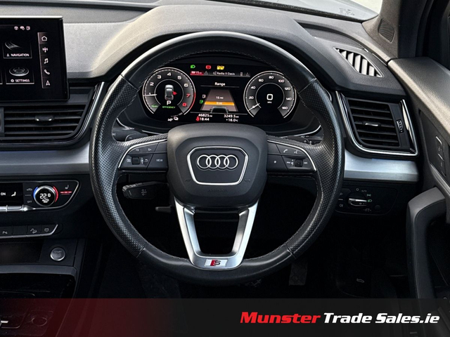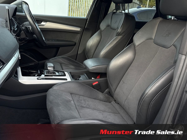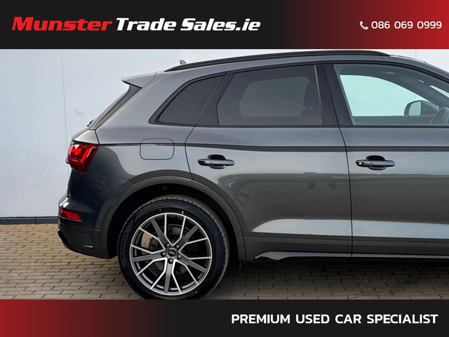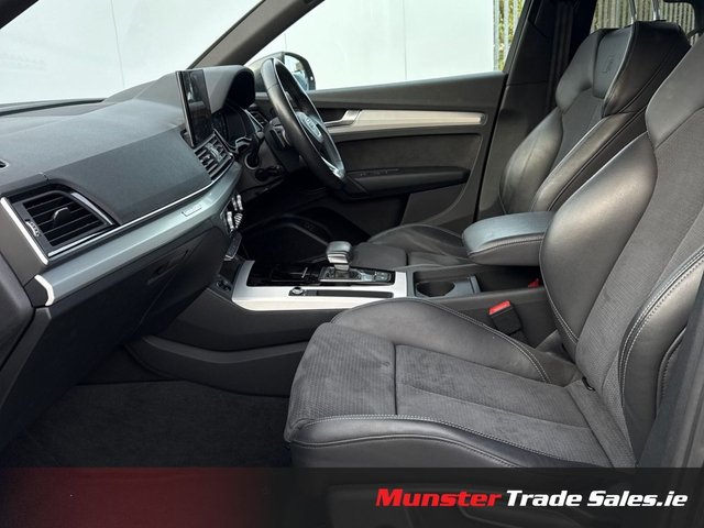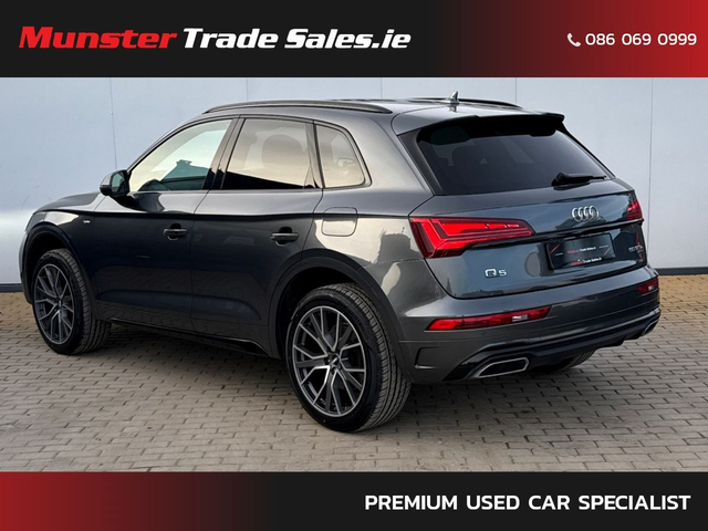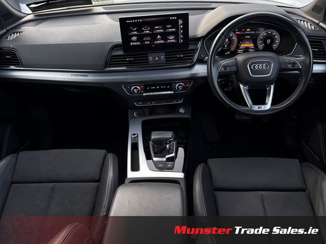 2021 Audi Q5 55 TFSI e quattro S line – Plug-in Hybrid SUV Finished in Daytona Grey Pearlescent with a premium Black/Dinamica “Frequenz” S line Interior, this Q5 combines sporty design, hybrid efficiency, and quattro capability. Performance & Efficiency • 2.0 TFSI Petrol + Electric Motor (Plug-in Hybrid) • 367 PS combined output / 220 kW system power • 7-speed S tronic automatic • quattro with ultra technology • Regenerative braking & multiple driving modes S line Package • 20” alloys, diamond-turned • S line exterior styling with gloss black details • Sports suspension & sports seats with “S” embossing • Illuminated scuff plates with S logo Comfort & Tech • Panoramic 360° Camera System • Electrically operated tailgate • Front heated sports seats with 4-way lumbar support • 3-Zone Deluxe Climate Control with Pre-conditioning • Privacy Glass • Ambient Lighting Package Plus Infotainment & Connectivity • MMI Navigation Plus with Touch • Audi Virtual Cockpit • Bang & Olufsen Premium 3D Sound System • Audi Smartphone Interface + Wireless Charging • Audi Connect with Remote & Control Safety & Driver Assistance • Parking Aid Plus with sensors front & rear • Matrix LED Headlights with Dynamic Light Design • Audi Pre Sense City • Cruise Control with Speed Limiter • ISOFIX front & rear • Full suite of airbags incl. curtain & side A premium luxury hybrid SUV with sporty S line styling, quattro all-wheel drive, and impressive efficiency. Available now at Munster Trade Sales, Limerick • Full vehicle Service & inspection • Professionally valeted & Detailed • Car History Checked • Finance Available