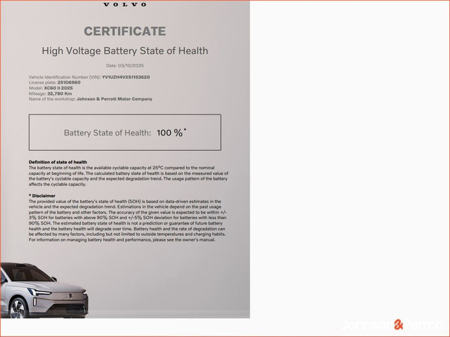 Please call us on 021-4804600 to make an appointment to come and view this vehicle at Johnson & Perrott Volvo, Bishopstown, Cork. We are located on the Bandon Road, Bishopstown, Cork,T12 NX67, We are open Monday - Friday 09.00-17.45 and Saturday 10.00-16.00 and later by appointment. Volvo Selekt is the smartest way to buy a Used Volvo We select only the best available cars. We improve them through Volvo approved checks and then make them even better with the latest software upgrades. The package is completed with an extensive warranty, including Volvo assist – a comprehensive roadside assistance package and even a 30 day exchange promise to guarantee your satisfaction. Fully Updated Satellite navigation and car software We update your Satellite Navigation (if fitted) to the very latest maps and also download the latest apps to your car and car software, making your Selekt Volvo as good as new. Why Choose Us ? Johnson & Perrott have been serving the people of Cork since 1810, and as one of Irelands longest established companies we are dedicated to total customer care, both in sales and aftersales. We look forward to adding you to our extensive list of satisfied customers, with our large selection of Volvo Selekt cars a great selection of competitive finance offers, we can help you find a simple and easy payment method suited to your requirements. How to find Us ? Johnson & Perrott Volvo are located off Junction 3 of the N40 ring road in Cork City, Eircode T12 NX67. Please call us on 021-4804600 • • Air conditioning • Anti collision system • ABS • Bluetooth • Driver-side airbag • Passenger-side airbag • Panoramic sunroof • Tyre pressure monitor • Navigation system • Roof rails • Heated steering wheel • Parking camera • Leather steering wheel • 12v power outlet • Lane change assist • Dual zone climate control • Ambient lighting • Alarm system • Apple CarPlay • Emergency brake assist • Radio • Keyless entry • Cruise control • Adaptive cruise control • Daytime running lights • Electric side mirrors • Electric handbrake • Hill hold assist • Isofix • Seat belt warning • Side airbag • Speed limiter • Multi-function steering wheel • Sunroof • Traffic sign recognition • Alloy wheels • Electric sunroof • Climate control • Central locking • USB connection (front) • Immobilizer • 4WD • Electrically adjustable seats • Lumbar support • Sports seats • Lane departure warning • Touch screen display • Spoiler • Stability control • Start-stop system • Emergency tyre repair kit • Electric boot • Electric windows • Heated seats • High beam assist • Wifi • Rain sensor • Digital instrument panel • Traction control • Seat ventilation • Armrest • Adaptive headlights • Auto lights (dusk sensor) • LED headlights • Parking assistance • Front parking sensors • Rear parking sensors • Voice control • Leather interior • Air suspension