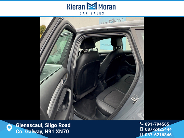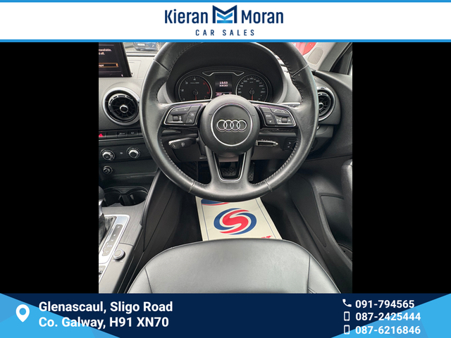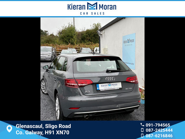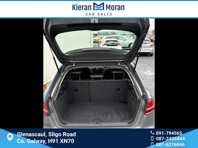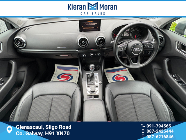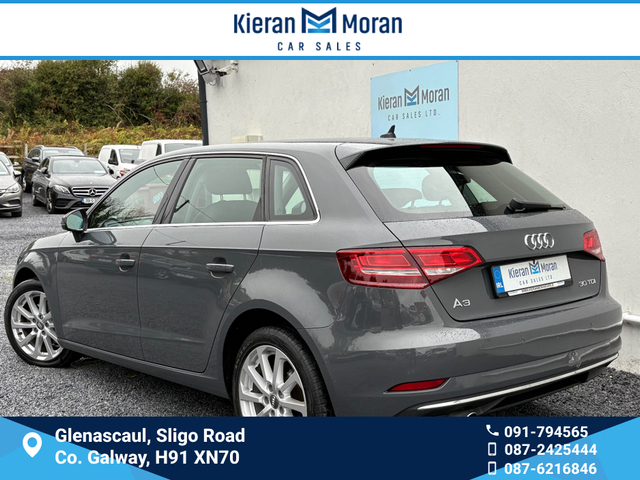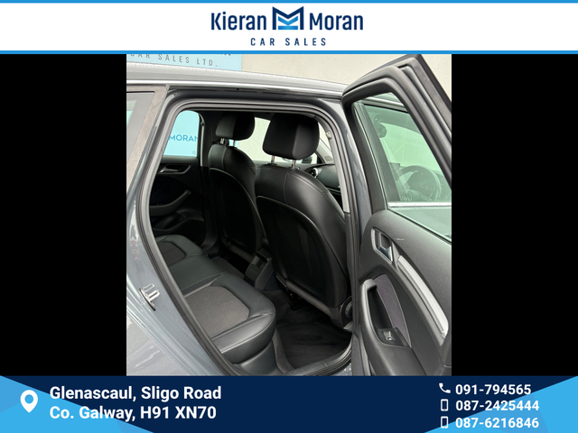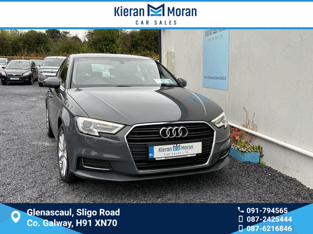Beautiful Audi A3 Auto in stock and now for sale. This beautiful car offers comfort, style and reliability with fantastic build quality that Audi is known for. Finished in Grey with 17" Audi Alloy Wheels, this car comes with an Automatic Transmission, Parking Sensors, Auto Lights, Auto Wipers, Electric Mirrors, Electric Windows and Front Foglights. Features Inside Include Beautiful Half Black Leather Interior Multifunction Steering Wheel Bluetooth Handsfree Cruise Control LED Trip Computer Adjustable Steering Column Pop-Up LED Centre Console Toggle Controls Audi Smartphone Connection Bluetooth Media AM/FM Radio CD Player 2x SD Card Slots 2x USB Slots Aux Slot 12v Plugs Air-Conditioning 2x Cup Holders Auto Stop/Start Function Auto Hold Function Adjustable Arm Rest Isofix Rear Seats Privacy Boot Cover This is a top class car, finished beautifully and driving brilliantly. A must see car to appreciate. For more information and all our stock visit www.kieranmorancars.ie 3 Month Warranty, Central Locking, Electric Windows, Airbag, Cruise Control, Fog Lamps, Rear Spoiler, Centre Armrest, Multi-function steering wheel, Roof Rails, Satellite Navigation, Traction Control, Metallic Paint, Parking Sensors, Bluetooth, EBD, Isofix, Apple Car Play, Android Auto, Active Safety Braking / City Brake / Collision Alert, Stop/Start Button, External Devices Connectivity, Cup holders, Remote boot/hatch/rear door release, Stability control