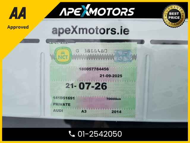 2014 AUDI A3 FINANCE ARRANGED * NEW NCT JUL-26 * IMMACULATE * STAMPED SERVICE HISTORY * AA APPROVED * 101 SAFETY CHECKLIST * AUTOMATIC (DSG) * COLOUR REVERSE CAMERA * LOW LOW KMs * ADAPTIVE CRUISE CONTROL