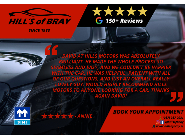Tailored finance options available up to 5 years with no deposit required. Apply online at www.hillsofbray.ie Vehicle under preparation - coming soon - register your interest with David on 0879870031 Spacious interior with a large estate boot, ideal for families or those needing extra space. Excellent fuel economy makes it cost-effective for longer journeys. NCT valid until April 2027, full service history included, and timing belt recently done. Low road tax of only €190 keeps running costs down. Price inclusive of -Full new service -Full valet -Cartell history and finance report -NCT -Warranty -Free home delivery nationwide Viewings and test drives by appointment only. All trade-ins are considered. Please contact David on 087 987 0031 for more information, or visit www.hillsofbray.ie Personalised vehicle video tour via WhatsApp available upon request. Follow us on Instagram @hillsofbray Why not check out our Google reviews? Hill's of Bray - we are a family run business since 1983 and a member of SIMI. Central Locking, Electric Windows, Airbag, Rear Spoiler, Centre Armrest, Multi-function steering wheel, Roof Rails, Satellite Navigation, Traction Control, Anti-Theft System, Parking Sensors, Bluetooth, EBD, Isofix, Active Safety Braking / City Brake / Collision Alert, Stop/Start Button, Touch Screen Media Control, External Devices Connectivity, Cup holders, Remote boot/hatch/rear door release, Stability control