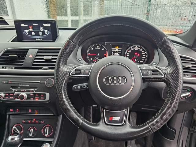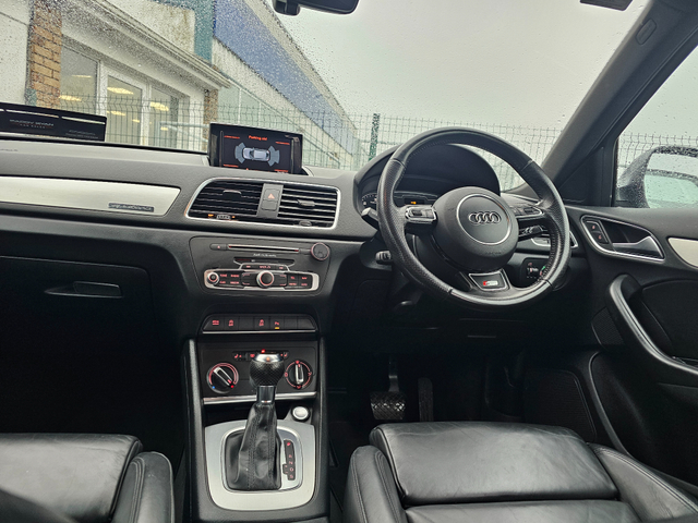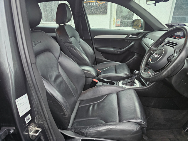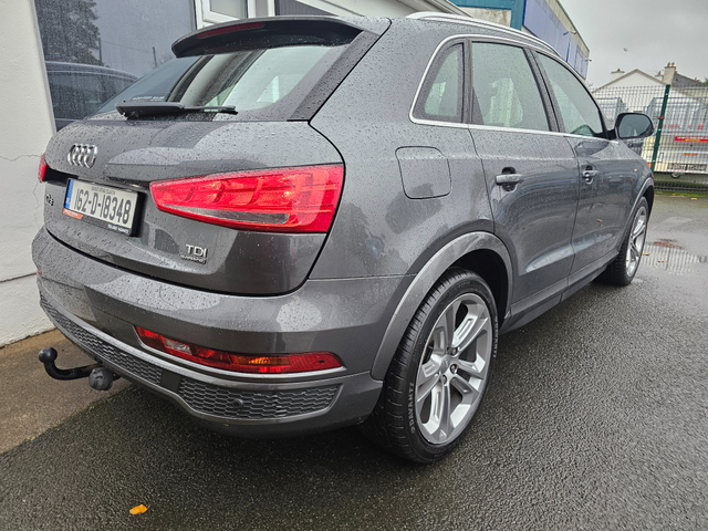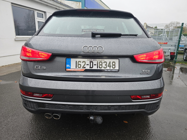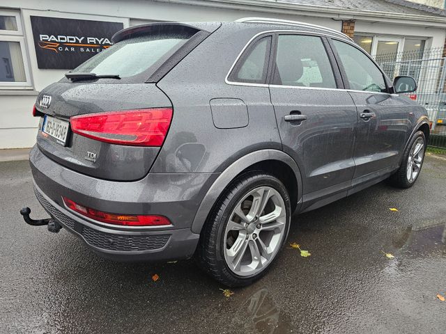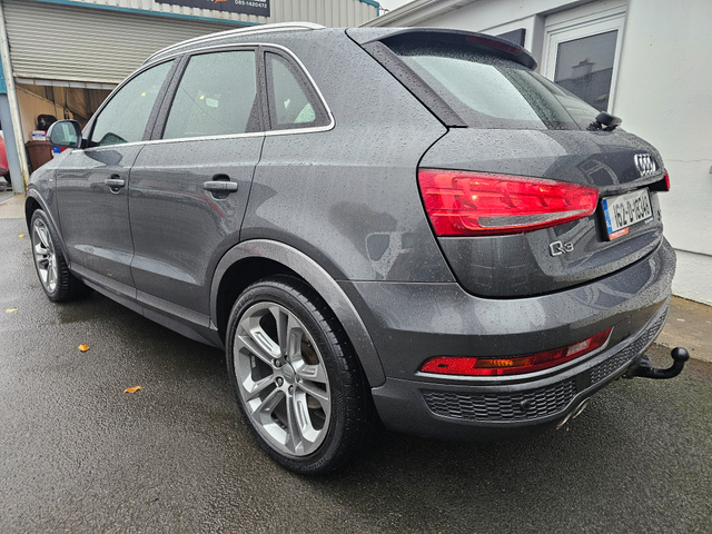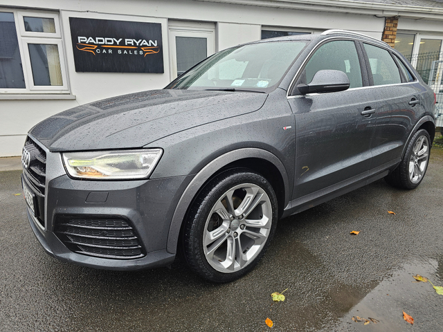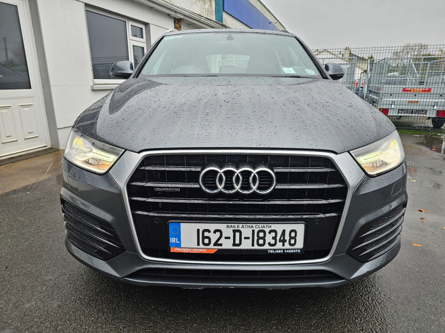 Viewing by appointment only 2016 Audi Q3 2.0Tdi Quattro S-Line Automatic 150Bhp All our cars come fully serviced with New Timing Belt Kit and New NCT where applicable. 3 Month/5,000 KMS Warranty included. Fully inspected by our AA approved mechanics. All vehicles come with a Full History Check. Finance available & Trade In's Welcome. Out of hours viewing available by appointment. Please call ahead to make sure car is still available. Call Paddy on 0851420472 to arrange a viewing or with any questions. 3 Month Warranty, Air Conditioning, Central Locking, Electric Windows, Airbag, Alloy Wheels, Cruise Control, Electric Mirrors, Leather Upholstery, Rear Spoiler, Full Leather, Sports Seats, Automatic Wipers, Centre Armrest, Multi-function steering wheel, Roof Rails, Traction Control, Metallic Paint, Multiple Air Bags, Xenon Lights, Parking Sensors, Bluetooth, Remote Central Locking, EBD, Electronic handbrake, Isofix, Hill holder, History Checked, Finance Checked, Heated Front Seats, Front Parking Sensors, Active Safety Braking / City Brake / Collision Alert, Stop/Start Button, Daytime Running Lights, 2 Keys, External Devices Connectivity, Cup holders, Remote boot/hatch/rear door release, Stability control