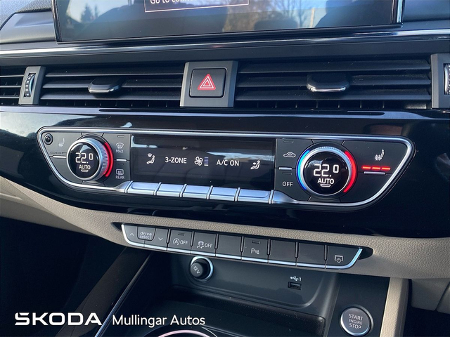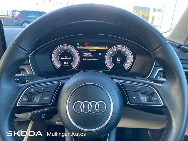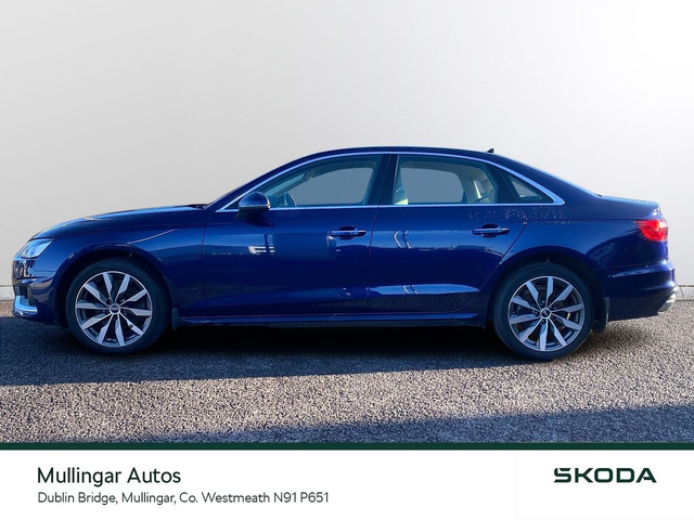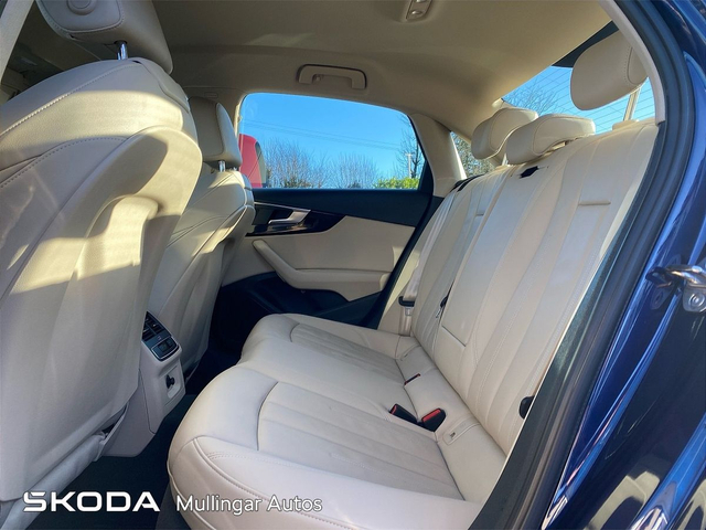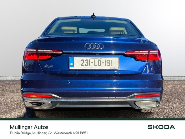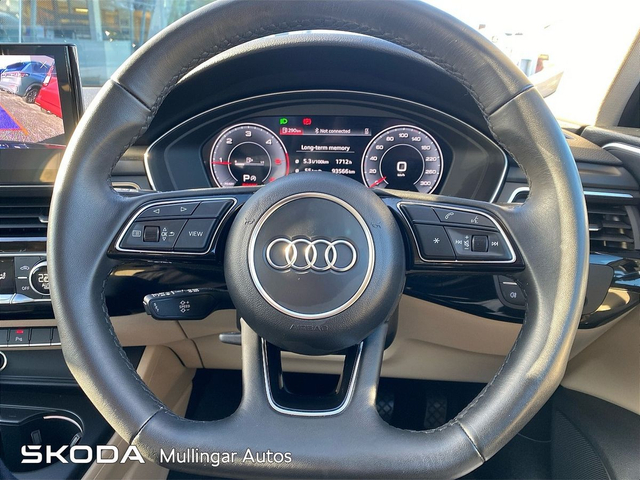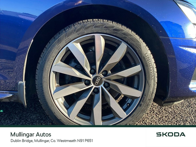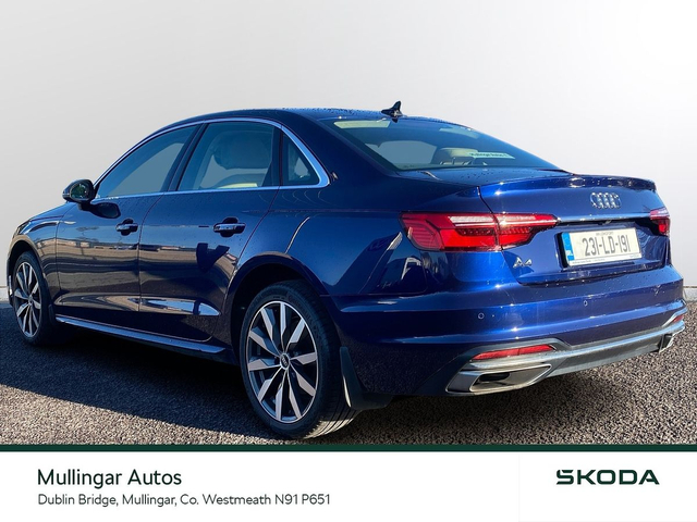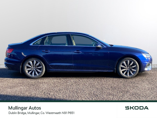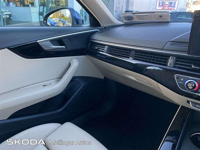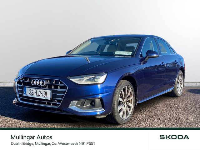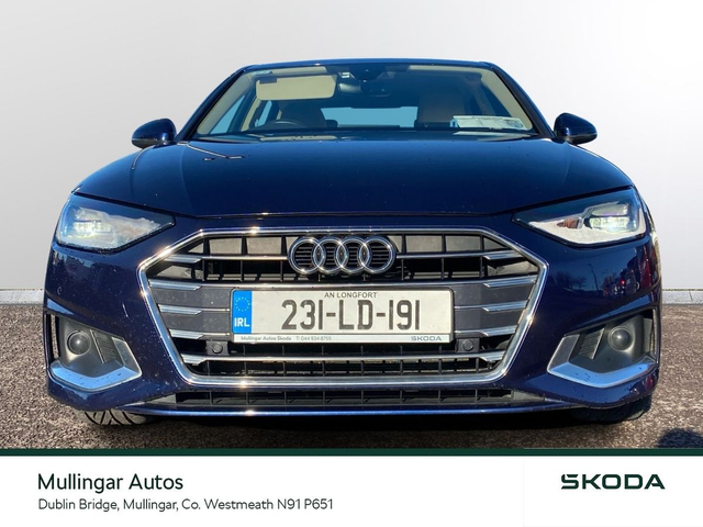 2023 Audi A4 SE 2.0 Diesel with Automatic gearbox. This A4 is finished in Navarra Blue and has cream leather interior. Has all the usual extras: LED running lights, headed seats, digital dashboard, 18" alloys, chrome pack, Audi dynamic drive settings, apple carplay/android auto and more. Trade ins welcome - Finance available. At Mullingar Autos, our Used Cars come with: Full vehicle history check. Comprehensive Warranty. Maintenance up to date. Competitive finance available. Outstanding Aftersales care. Want more finance info or reserve the car now for €199? - Available exclusively on www.mullingarautos.ie. Alternatively, call us now on 044 934 8755 or visit us on the Dublin Bridge, Mullingar, Co. Westmeath, N91 P651. • Front Electric Windows • Armrest • Auxiliary Jack Input • Bluetooth Phone • Climate Control • Driver Knee Airbag • Dual Climate Control • Mirrors electric and heated • Traction control • Air Conditioning • Front Restraints • Heated Seats • Height adjustable drivers seat • iPod Connection • Lumbar Support • Media Connection • Electric Mirrors • Adjustable steering column/wheel • Rear Curtain Airbags • MP3 Connection • Multi-Function Steering Wheel • Onboard Computer • Outside temperature meter • Power Steering • Rear armrest • Rear Electric Windows • Electric Windows • Leather Gear Lever • USB • Windows front + rear electric • Windshield heater • Car History Checked • Finance Available • Full Service History • Stop and Start System • Adjustable seats • Passenger Airbag • Passenger Knee Airbag • ABS • Auto Handbrake • Auto High Beam Assist • Auto Lights and Wipers • Auto Wipers • Centralised locking • Child Locks • 3x3point rear seat belts • Colour coding - Interior • ESP • Front Fog Lights • Hands Free Kit • Heated Mirrors • Immobilizer • ISO Fix • Multiple Airbags • Driver Airbag • Rear Parking Sensors • Remote Central Locking • Traction Control • Alloy Wheels • Body Coloured Bumpers • Body Coloured Bumpers/Mirrors • Chrome Package • Rear headrests • Curtain Airbags • Leather Interior • Leather Steering Wheel • Metallic Paint • Privacy Glass • Android Auto • Apple Car Play • Rearview Camera