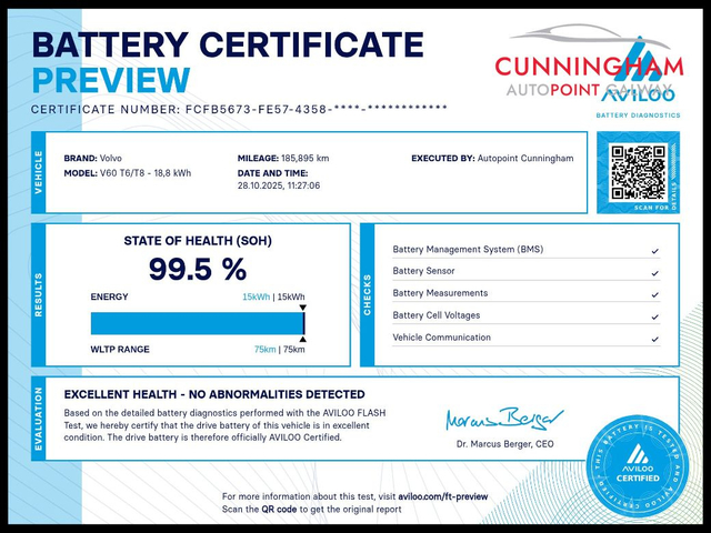 2022 (222) V60 T6 Ultimate Recharge AWD in Onyx Black with Black Nappa Leather interior. A one owner car with full Volvo service history this V60 is offered at well under 40% of its new price simply due to its higher than average mileage yet is presented in as-new condition, without mileage related wear of any nature. Coming with a 99.5% Battery Health Score from Aviloo, the worlds #1 EV battery testing company. See certificate in vehicle images, scan QR code in image for extra information. The V60 T6 Recharge AWD is a premium plug-in hybrid estate with a combined 350 bhp and all-wheel drive. It offers a blended driving experience with both a turbocharged engine and an electric motor, resulting in high power output, impressive acceleration, and significant fuel efficiency with an all-electric range of up to 75km (92km WLTP) from its 18.8kWh battery. Features include 8-speed Automatic transmission - Panoramic Roof - Pilot Assist Adaptive Cruise Control - 360-degree Cameras and Park assist - 19-inch 5-Triple Spoke Black Diamond Cut Alloy Wheels - Heated Steering Wheel - Heated front seats - Heated Rear Seats - Heated Windscreen - Keyless Drive (includes Keyless Entry and Keyless Start) - Harman Kardon Premium Sound System - Google Assistant, Google Maps and Google Play Store - Apple CarPlay - Sports Contour front seats, fully electric, with memory function - Full LED headlights - Orrefors® Crystal Gear Lever - Road Sign Information - Driver Alert Control with Lane Keeping Aid - Autofolding Heated Power Door Mirrors - Integrated Roof Rails in High Gloss Black - Power Operated Tailgate - Tinted rear windows - Oncoming Lane Mitigation - Slippery Road Alert and Hazard Light Alert - Power Child Locks - ISOFIX Attachment (Outer Rear Seats) - Anti-theft Alarm including Immobiliser. This car will be fully serviced prior to sale and comes complete with a 12 months / 20,000km warranty with 12 Months AA Premium Assistance. *Real world range is quoted from EV-database.org, an independent EV range monitoring website. Customers are advised to do their own research to further learn of a cars expected real-world versus claimed range. The EV-database website is well worth checking out as a source of extended information on all makes and models of Electric vehicles, both current models and previous models. We accept certain makes and models in Part Exchange subject to having full service history, a current NCT test (minimum six months to expiry) and verifiable mileage. To discuss this car further and / or receive a part exchange valuation please call into our showroom, phone us on 091 383000 or send us an online enquiry - You can also reserve this car for 48 hours on our website - Due to fast stock turnaround we recommend phoning in advance of travelling to check if the car of your choice is available - We are an independently owned and operated dealership and our highly experienced team have over 100 years of combined motor industry experience.