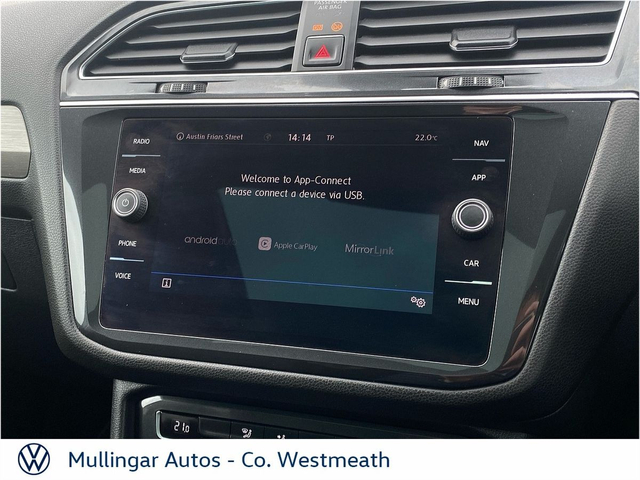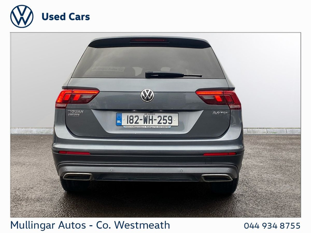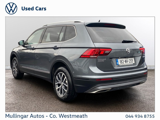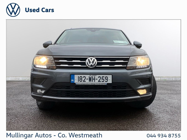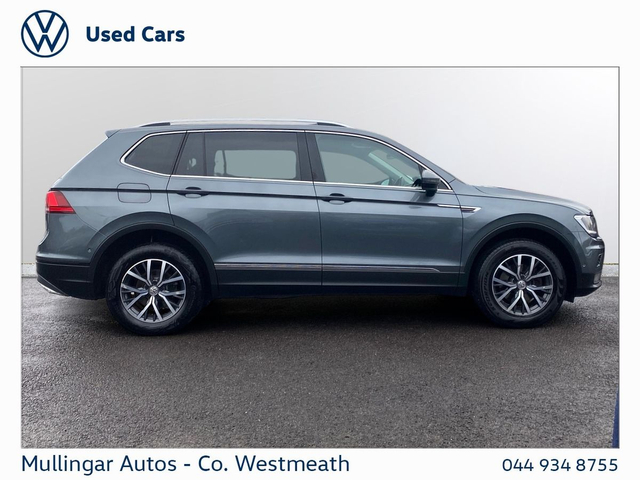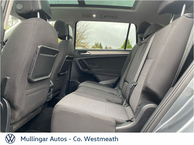 2018 Tiguan Allspace 2.0 Diesel, finished in Platinum Grey Metallic. Clean 7 seat SUV, with full history. Comfortline with great spec, including: Rear view camera, sunroof, front and rear sensors, electric open/close boot, LED running lights, dual climate control, onboard computer, apple carplay/android auto and much more. Trade ins welcome - Finance available. At Mullingar Autos, our Used Cars come with: Full vehicle history check. Comprehensive Warranty. Maintenance up to date. Competitive finance available. Outstanding Aftersales care. Want more finance info or reserve the car now for €199? - Available exclusively on www.mullingarautos.ie. Alternatively, call us now on 044 934 8755 or visit us on the Dublin Bridge, Mullingar, Co. Westmeath, N91 P651. • ABS • Child Locks • Daytime Running Lights • ESP • ISO Fix • Multiple Airbags • Adjustable Steering Column • Air Conditioning • Dual Climate-Control • Leather Multi-functional Steering Wheel • Onboard Computer • Split Fold Rear Seats • USB • Alloy Wheels • Chrome Package • Electric Mirrors • Front Fog Lights • Metallic Paint • Sunroof • Tinted Windows • Full Service History • Adaptive Cruise control • Front & Rear Sensors • Rear View Camera • Android Auto • Apple Carplay