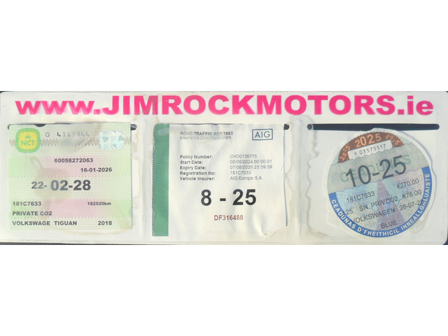 WELL SPECKED VW TIGUAN HIGHLINE......2.0 TDI.......NCT 02/28.......€270 PER YEAR ROAD TAX........6 SPEED WITH CRUISE CONTROL.......UPGRADED ALLOYS......PARKING SENSORS........PARK ASSIST.......REVERSE CAMERA......SAT NAV......BLUETOOTH.......DIGITAL COCKPIT.......TOUCH SCREEN MUTI MEDIA DISPLAY......AIR CON......HEATED SEATS.......UPGRADED UPHOLSTERY......UPGRADED ALLOYS.......PRIVACY GLASS.......ROOF RAIL......DETACHABLE TOW BAR......ALL OUR CARS COME FRESHLY VALETED AND SERVICED......TRADE IN ACCEPTED......WARRANTY....... WWW.JIMROCKMOTORS.IE Perfect working order, Price Or Near Offer, 3 Month Warranty, Trade in accepted, Air Conditioning, Central Locking, Immaculate condition, Electric Windows, Airbag, Alloy Wheels, Electric Mirrors, Fog Lamps, Immobiliser, Privacy Glass, Centre Armrest, Luggage Cover, Multi-function steering wheel, Roof Rails, Satellite Navigation, Traction Control, Metallic Paint, Multiple Air Bags, Side Impact Protection, Anti-Theft System, Parking Sensors, Bluetooth, Remote Central Locking, EBD, Electronic handbrake, Folding rear seats, Six speed transmission, Isofix, History Checked, Finance Checked, Reversing Camera, Active Safety Braking / City Brake / Collision Alert, Stop/Start Button, External Devices Connectivity, Cup holders, Remote boot/hatch/rear door release, Stability control