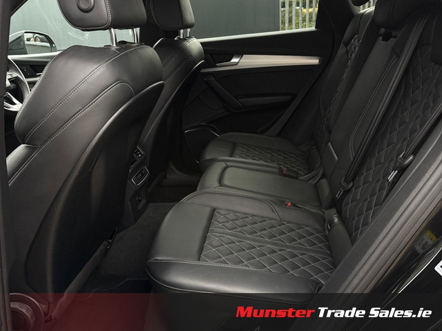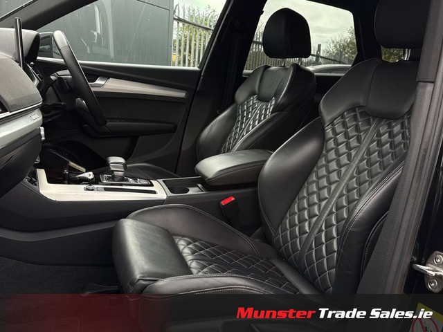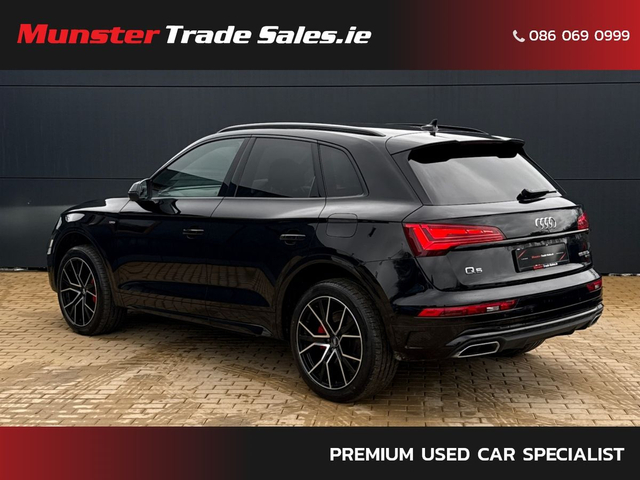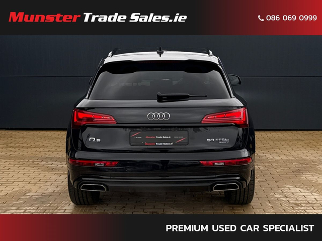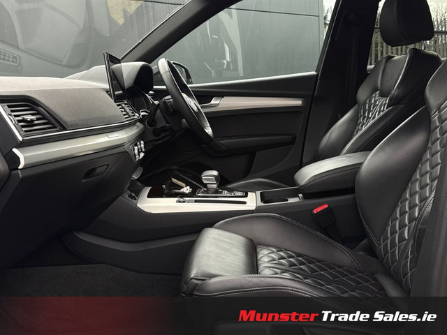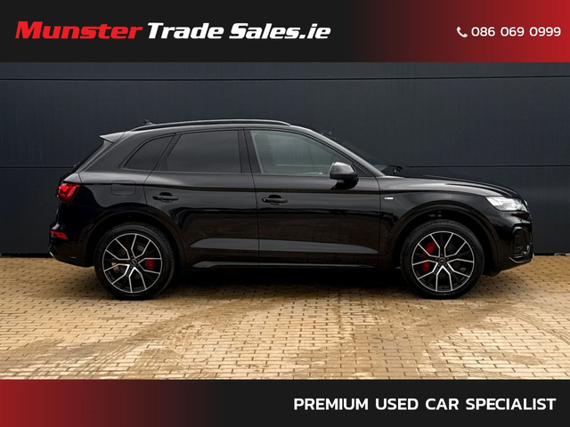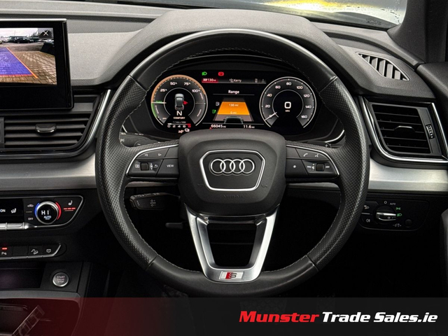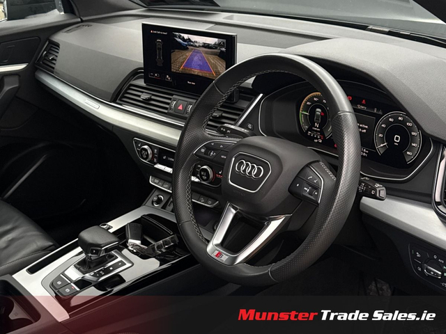 2022 Audi Q5 2.0 TFSI e S line quattro Competition Mythos Black Metallic | Fine Nappa Leather | 220 kW Plug-in Hybrid This high-spec S line Q5 combines plug-in hybrid efficiency with Audi’s quattro all-wheel drive and luxury refinement. Key Details • Year: 2022 • Model: Audi Q5 2.0 TFSI e S line • Engine: 2.0 TFSI Petrol Hybrid – 195 kW (engine) / 220 kW (system output) • Transmission: 7-Speed S tronic Automatic • Drive: quattro all-wheel drive (with ultra technology) • Colour: Mythos Black Metallic • Interior: Fine Nappa Leather with S embossing Highlights & Features • 20” 5-Segment-Spoke Graphite Grey Alloy Wheels • Matrix LED Headlights & Dynamic Rear Indicators • S line Body Styling with Gloss Black Accents • Reversing Camera & Park Assist with Parking System Plus • Audi Virtual Cockpit & MMI Navigation Plus with Touch • Bang & Olufsen Premium Sound System (if fitted – confirm) • Ambient Lighting Package • 3-Zone Climate Control with Acoustic/Heat-Reflecting Glass • Front Sport Seats with 4-Way Lumbar & Heating • Electrically Operated Tailgate • Sun Protection Privacy Glass • Comfort Center Armrest & Illuminated S Door Sills • quattro Drive Select System • Hybrid Charging Package (Mode 3 Cable, UK Type G Plug, 22 kW Public Charging Capability) A luxurious hybrid SUV offering sporty styling, cutting-edge lighting, and premium comfort. Available now at Munster Trade Sales, Limerick.