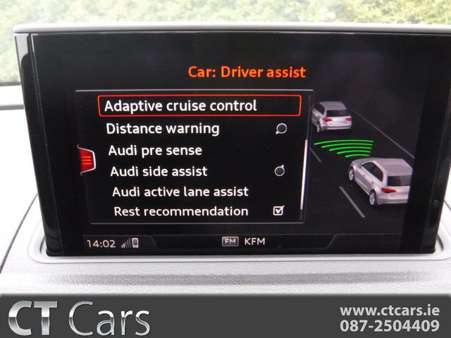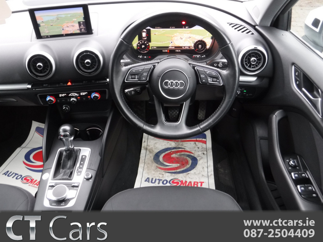 AUDI A3 1.4 FTSI AUTOMATIC S-TRONIC SPORTBACK COMES IN MINT CONDITION WITH LOW MILEAGE AND COMES FULLY SERVICED WITH A NEW NCT FOR 2 YEARS PLUS 6 MONTHS DEALER WARRANTY . THIS CAR IS READY TO DRIVE AWAY TODAY. EXTRAS INCLUDE KEYLESS ENTRY AND PUSH BUTTON START ANDROID AUTO AND APPLE CARPLAY VIRTUAL COCKPIT WITH LATEST MAPS ADAPTIVE CRUISE CONTROL AUDI PRE SENSE LANE ASSIST BLIND SPOT ASSIST PRIVACY GLASS 2 REMOTE KEYS FRONT AND REAR PARKING SENSORS AUTO LED HEADLIGHTS Full Service History, Perfect working order, 6 Month Warranty, Trade in accepted, Air Conditioning, Central Locking, Immaculate condition, Electric Windows, Airbag, Alarm, Alloy Wheels, Cruise Control, Electric Mirrors, Fog Lamps, Immobiliser, Privacy Glass, Automatic Wipers, Automatic Lights, Centre Armrest, Multi-function steering wheel, Climate Control, Satellite Navigation, Traction Control, Metallic Paint, Multiple Air Bags, Xenon Lights, Anti-Theft System, Parking Sensors, Bluetooth, Brand New Tyres, Remote Central Locking, Electronic handbrake, Folding rear seats, Isofix, History Checked, Finance Checked, Apple Car Play, Android Auto, Mirror Link, Keyless Entry, Reversing Camera, Front Parking Sensors, Lane Departure Warning, Electro Chrome Rear View Mirror, Active Safety Braking / City Brake / Collision Alert, Adaptive Cruise Control, Stop/Start Button, Drive Mode Selector, Dual Zone Climate Control, Daytime Running Lights, 2 Keys, Cup holders, Remote boot/hatch/rear door release, Stability control
