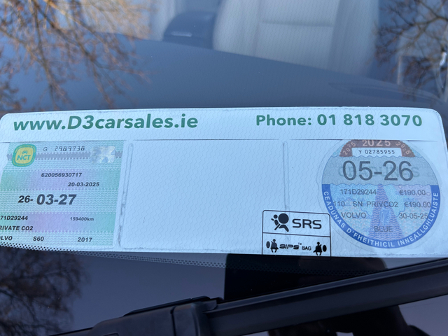 2017 Volvo S60 Automatic NCT 03/2027 D3 Cars, Clontarf, Dublin 3 D3 Cars are delighted to present this 2017 Volvo S60 Automatic, a stylish and reliable saloon offering comfort, safety, and excellent driving performance. Well maintained and in great condition throughout, this car is ideal for both city and motorway driving. NCT valid until March 2027 Smooth Automatic Transmission Renowned Volvo safety and comfort Key Features Include Alloy Wheels Full Leather Interior Heated Front Seats Parking Camera Satellite Navigation Electric Windows Air Conditioning Remote Central Locking Cruise Control Parking sensors This Volvo S60 offers a premium driving experience with excellent comfort and practicality. Viewing is highly recommended. Contact D3 Cars, Clontarf, Dublin 3 today to arrange a test drive.