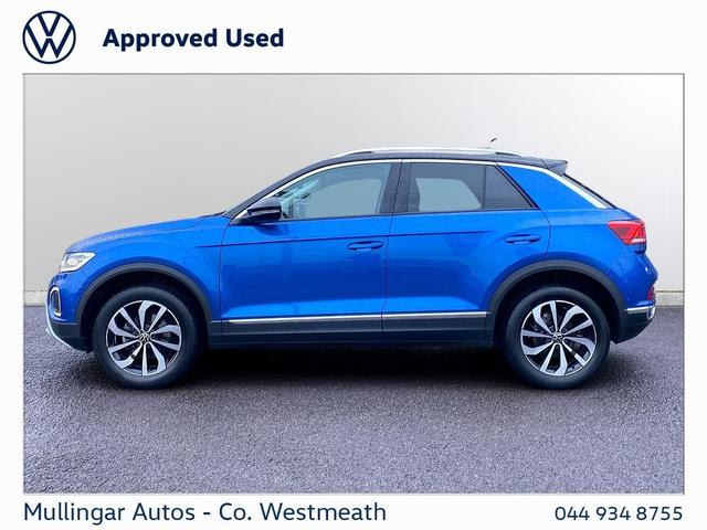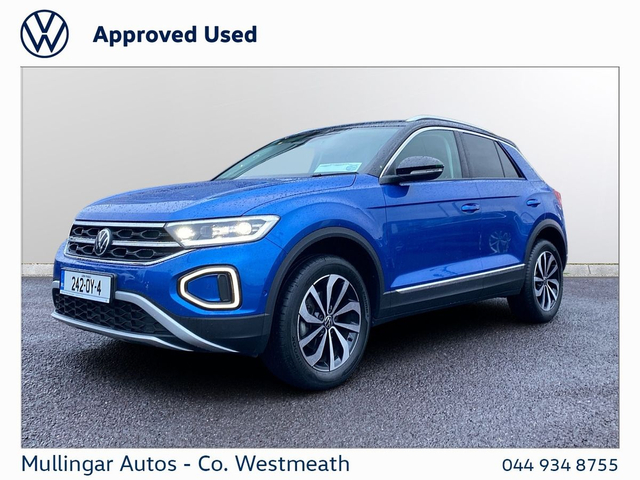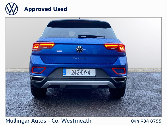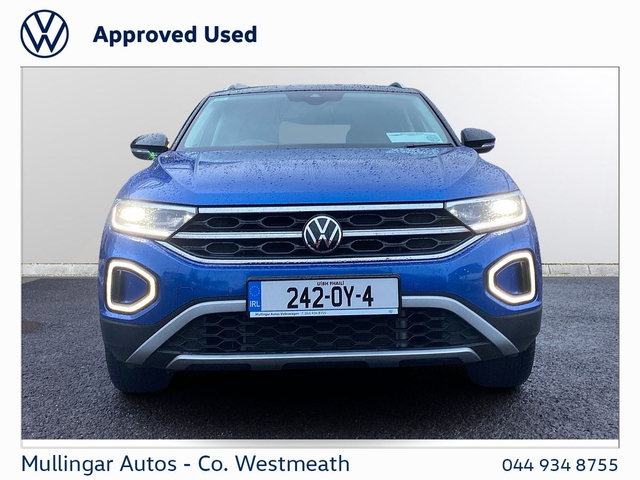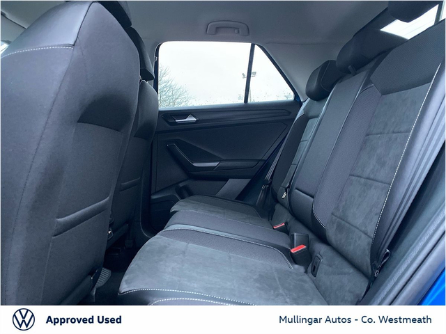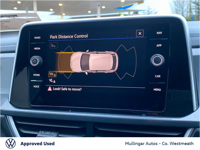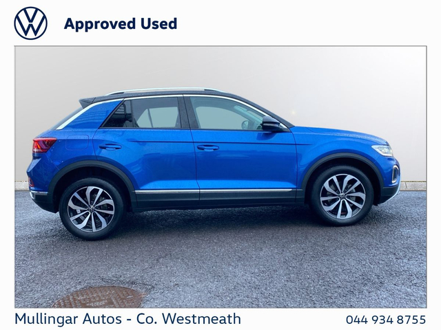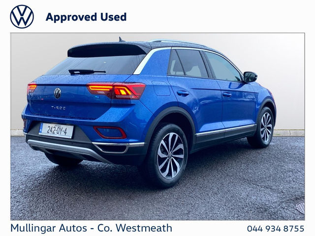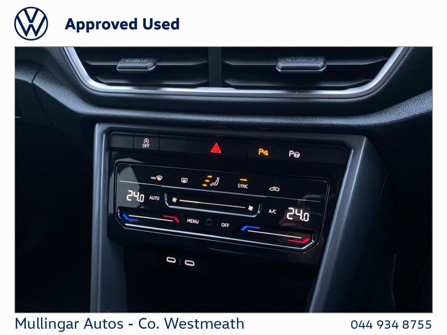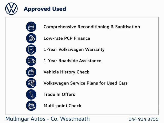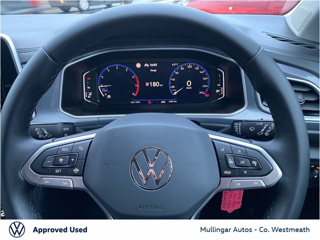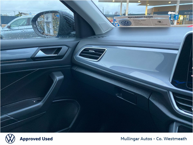 Contact : Gerry Coyne 0872599455 This VW T-Roc is like New. Only 6380 Km. Trade ins welcome - Finance available. At Mullingar Autos, our Used Cars come with: Full vehicle history check. Comprehensive Warranty. Maintenance up to date. Competitive finance available. Outstanding Aftersales care. Want finance info, to view a video of this vehicle or reserve it now – Simply visit www.mullingarautos.ie. Alternatively, call us now on 044 934 8755 or visit us on the Dublin Bridge, Mullingar, Co. Westmeath, N91 P651. • ABS • Driver Airbag • Passenger Airbag • Side Airbag • Child Locks • Daytime Running Lights • Deadlocks • Flat Tyre Indicator • ISO Fix • Multiple Airbags • Side Impact Protection • Immobilizer • Auto Handbrake • Auto Lights and Wipers • Cruise Control • Hill Hold • Parking Assistance • Power Steering • Remote Central Locking • Satellite Navigation • Stop and Start System • Total Closure System • Adjustable Steering Column • Armrest • Bluetooth Phone • Dual Climate-Control • Leather Multi-functional Steering Wheel • Lumbar Support • Onboard Computer • Split Fold Rear Seats • Touchscreen Stereo • 17" Alloys • Chrome Package • Electric Mirrors • Electric Windows • Metallic Paint • Privacy Glass • Full Service History • Adaptive Cruise control • Front & Rear Sensors • Reversing Camera • Spare Wheel