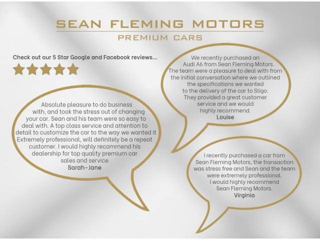 Welcome to Sean Fleming Motors where our family name has been synonymous with the motor trade in Galway for several generations. The business is owned and managed by Sean Fleming alongside his wife Maura. Each vehicle on sale has been handpicked by Sean specialising in premium brand vehicles. Our cars prepared to the highest standards through our in house service center by our technicians including a factory trained master technician. We supply a history report with verified mileage with every car. Trade ins are welcome with all makes and models considered. We have strong relationships with several finance companies and as such can offer tailored finance packages in house to suit your monthly budget. Our prices are checked daily and priced correctly considering mileage / spec / condition (we are confident). Call to discuss any car you might be interested in or request a personalised video by WhatsApp. Central Locking, CD Player, Electric Windows, Airbag, Cruise Control, Centre Armrest, Multi-function steering wheel, Satellite Navigation, Traction Control, Metallic Paint, Parking Sensors, Bluetooth, EBD, Isofix, Apple Car Play, Android Auto, Active Safety Braking / City Brake / Collision Alert, Stop/Start Button, External Devices Connectivity, Cup holders, Remote boot/hatch/rear door release, Stability control