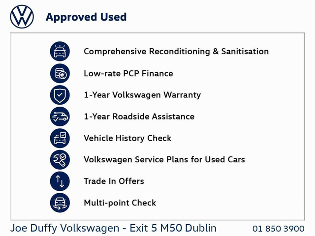 Another fantastic used car brought to you by Joe Duffy Volkswagen North Dublin. This car is priced as a used car although it comes to you with all the benefits of a new car, 3 Years Warranty 3 Years Servicing* 3 Years Road Side assistance Tailored finance Packages to suit your budget Same day collection! Not only can finance can be arranged onsite instantly, For a limited time we also offer €500 deposit contribution. Call us today on 01-850-3900 to arrange a viewing or to request a tailored video.