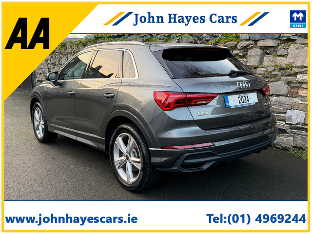 **We operate appointment only for viewings, please make contact to arrange a test drive thank you**Beautiful high specidfication 2024 Audi Q3 S Line 45 TFSi PHEV Hybrid with only 18000 kms. Just serviced by Audi. Looks great in Datyona Grey Metallic. Fantastic upgraded specification. Fully prepared for sale. Trade in's are welcome and finance packages to suit. We operate on an appointment only basis for viewings, please contact 0879068112 to arrange. Thank you. Upgraded Sonos interior surround sound package, wireless phone charging pad, reverse camera with front and rear park assist, cruise control, traction control, LED daytime running lights, diamond cut alloys, leather upholstery with heated seats, sun protect rear glass, large digital cerntre display, centre armrest, folding exterior door mirrors, muli finction comfort leather steering wheel, lumbar support font seats, Audi hybrid technology, Apple Carplay, Android Auto, multi phone bluetooth with full media play. John Hayes Cars, a very well known and trusted family dealer in high quality vehicles since 1986 and based in Rathmines since 1998. For extra peace of mind for our customers we also provide a free car history report for all of our vehicles. Thank you. 12 Month Warranty, Central Locking, Electric Windows, Airbag, Cruise Control, Rear Spoiler, Privacy Glass, Centre Armrest, Multi-function steering wheel, Roof Rails, Satellite Navigation, Traction Control, Metallic Paint, Anti-Theft System, Parking Sensors, Bluetooth, Isofix, Apple Car Play, Android Auto, Active Safety Braking / City Brake / Collision Alert, Stop/Start Button, 2 Keys, External Devices Connectivity, Cup holders, Stability control