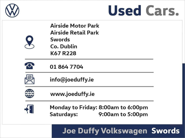 | Contact info: | Joe Duffy Volkswagen (Swords) Airside Motor Park Swords County Dublin Ph: 01-8580240 |