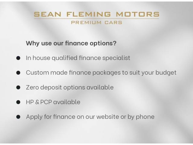 Welcome to Sean Fleming Motors where our family name has been synonymous with the motor trade in Galway for several generations. The business is owned and managed by Sean Fleming alongside his wife Maura. Each vehicle on sale has been handpicked by Sean specialising in premium brand vehicles. Our cars prepared to the highest standards through our in house service center by our technicians including a factory trained master technician. We supply a history report with verified mileage with every car. Trade ins are welcome with all makes and models considered. We have strong relationships with several finance companies and as such can offer tailored finance packages in house to suit your monthly budget. Our prices are checked daily and priced correctly considering mileage / spec / condition (we are confident). Call to discuss any car you might be interested in or request a personalised video by WhatsApp. Central Locking, Electric Windows, Airbag, Rear Spoiler, Multi-function steering wheel, Traction Control, Bluetooth, EBD, Isofix, Active Safety Braking / City Brake / Collision Alert, Stop/Start Button, External Devices Connectivity, Cup holders, Remote boot/hatch/rear door release, Stability control