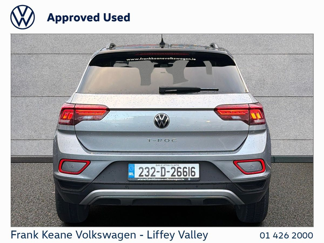 FRANK KEANE - Customer Driven Since '67. T-ROC LIFE at Frank Keane Volkswagen Liffey Valley, We have this 2023 Volkswagen T-Roc Life with just 65,982km. Finished in Silver ,Black Roof with a Cloth Seat Interior. Experience complete confidence with the Frank Keane Volkswagen Optional Pre-Owned Vehicle Protection Pack — including a 24-month warranty, 3-year Return to Invoice (RTI) investment protection, and 3-year paint, glass, and upholstery protection with LifeShine. Premium cover, expertly designed to protect your vehicle and your investment. To Learn more, speak to one of our Sales Team in Frank Keane Volkswagen Liffey Valley today. Specification that Includes • 16” Chester Alloy wheels, • Rear View Camera, • Privacy Glass, • LED Headlights, • Front and Rear Parking Sensors, • Cloth Seats, • Adaptive Cruise Control, • Dual-Zone Climate Control, • Air-conditioning, • Folding Mirrors, • ISOFIX Child Seat Mounts, • USB-C Connectivity, • Automatic Lights, • Electric Handbrake with Auto Hold, • Digital Cockpit Display, • Roof Rails, • Apple Car Play & Android Auto, • and much more! Please contact our Sales Team today for a Personalized Video of this Car, Digital Part Exchange Valuations and Tailored Funding Options to meet your needs on 01-4262000 or email [email protected] Frank Keane Volkswagen offers the highest levels of value and customer experience across both sales and service. Located at Liffey Valley Motor Mall, we ensure all our used vehicles are prepared to the highest of standards and come with a minimum of 12 months warranty. Call us 01-4262000 to arrange an appointment with our Sales Team. FRANKKEANEVOLKSWAGEN.IE