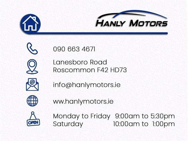 NEW STOCK Welcome to Hanly Motors, Roscommon Established in 2009, Hanly Motors is a family-run business proudly serving customers for over 14 years. The garage is owned and operated by Declan Hanly, alongside his wife Roberta. Each vehicle is personally handpicked by Declan to ensure quality and reliability. All of our cars are prepared to the highest standards in our fully equipped, in-house workshop, where our qualified technicians carry out rigorous checks and servicing. History reports are available on request for complete peace of mind. Trade-ins welcome all makes and models considered Finance options available we work with a wide range of lenders Poor credit history? We may still be able to help? For more details contact our sales team today Declan 086 876 9291 Alan 083 037 0018 Features - Central Locking, Electric Windows, Airbag, Fog Lamps, Privacy Glass, Centre Armrest, Multi-function steering wheel, Roof Rails, Traction Control, Parking Sensors, Bluetooth, EBD, Isofix, Active Safety Braking / City Brake / Collision Alert, Stop/Start Button, Touch Screen Media Control, External Devices Connectivity, Cup holders, Remote boot/hatch/rear door release, Stability control