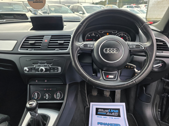 Audi Q3 S-Line 2.0 Diesel Manual Low Miles (132) Brand New NCT 11/26 Half Leather Sports Seats Cartell History Checked Xenon Headlights Service History LED Daytime running Lights Full Electric windows Rear Parking Sensors 18" S-Line Alloy Wheels 6 Speed Manual Dual Climate Control A/C Heated Mirrors Bluetooth Multimedia x2 Keys And so Much More 3 month warranty as Standard! For any more info please contact us 0877784077 or Email [email protected] FINANCE ARRANGED! https//www.bluelineauto.ie/ 3 Month Warranty, Central Locking, Electric Windows, Airbag, Fog Lamps, Multi-function steering wheel, Roof Rails, Traction Control, Metallic Paint, Parking Sensors, Bluetooth, EBD, Isofix, Active Safety Braking / City Brake / Collision Alert, Stop/Start Button, 2 Keys, External Devices Connectivity, Cup holders, Remote boot/hatch/rear door release, Stability control