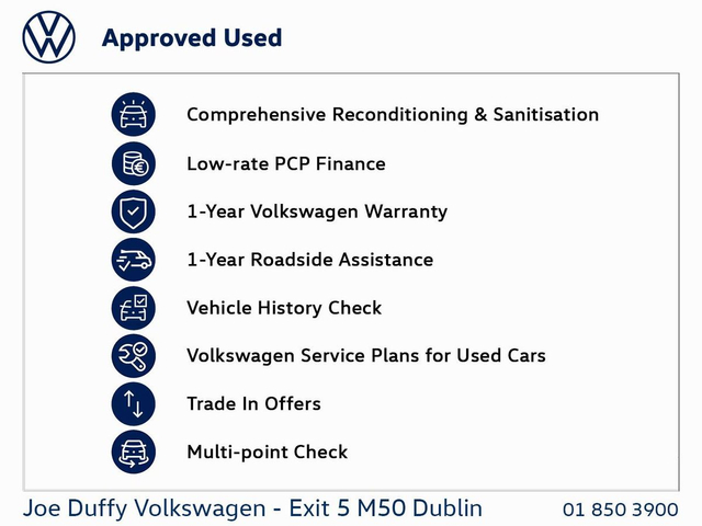 Another fantastic used car brought to you by Joe Duffy Volkswagen North Dublin. This car is priced as a used car although it comes to you with all the benefits of a new car, 3 Years Warranty 3 Years Servicing* 3 Years Road Side assistance Tailored finance Packages to suit your budget Same day collection! Not only can finance can be arranged onsite instantly, For a limited time we also offer €500 deposit contribution. Call us today on 01-850-3900 to arrange a viewing or to request a tailored video. • Driver Airbag • Passenger Airbag • Child Locks • ISO Fix • Multiple Airbags • Auto Lights and Wipers • Air Conditioning • Bluetooth Phone • R-Line