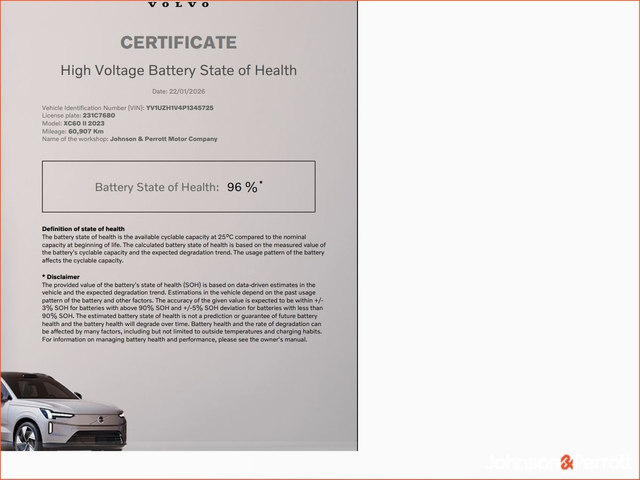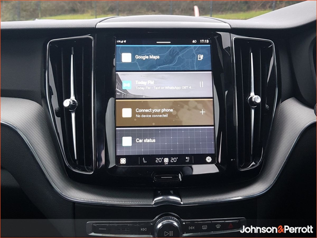 Please call us on 021-4804600 to make an appointment to come and view this vehicle at Johnson & Perrott Volvo, Bishopstown, Cork. We are located on the Bandon Road, Bishopstown, Cork,T12 NX67, We are open Monday - Friday 09.00-17.45 and Saturday 10.00-16.00 and later by appointment. Volvo Selekt is the smartest way to buy a Used Volvo We select only the best available cars. We improve them through Volvo approved checks and then make them even better with the latest software upgrades. The package is completed with an extensive warranty, including Volvo assist – a comprehensive roadside assistance package and even a 30 day exchange promise to guarantee your satisfaction. Fully Updated Satellite navigation and car software We update your Satellite Navigation (if fitted) to the very latest maps and also download the latest apps to your car and car software, making your Selekt Volvo as good as new. Why Choose Us ? Johnson & Perrott have been serving the people of Cork since 1810, and as one of Irelands longest established companies we are dedicated to total customer care, both in sales and aftersales. We look forward to adding you to our extensive list of satisfied customers, with our large selection of Volvo Selekt cars a great selection of competitive finance offers, we can help you find a simple and easy payment method suited to your requirements. How to find Us ? Johnson & Perrott Volvo are located off Junction 3 of the N40 ring road in Cork City, Eircode T12 NX67. Please call us on 021-4804600 • • Climate control • Apple CarPlay • Electric side mirrors • 4WD • Lumbar support • Hill hold assist • Rear parking sensors • Ambient lighting • Alarm system • Immobilizer • Electric handbrake • Armrest • Auto lights (dusk sensor) • 12v power outlet • ABS • Bluetooth • Central locking • Keyless entry • USB connection (front) • USB connection (rear) • Electric boot • Passenger-side airbag • Heated seats • Lane departure warning • Tyre pressure monitor • Touch screen display • Parking assistance • Start-stop system • Air conditioning • Dual zone climate control • MP3 compatible • Emergency brake assist • Electric windows • Electrically adjustable seats • LED headlights • Front parking sensors • Multi-function steering wheel • Traffic sign recognition • Digital instrument panel • Parking camera • Android Auto • Anti collision system • Radio • Cruise control • Daytime running lights • Traction control • Driver-side airbag • Panoramic sunroof • Isofix • Speed limiter • Heated steering wheel • Emergency tyre repair kit • Wifi • Sport suspension • Navigation system • Remote boot release • Side airbag • Stability control • Electric sunroof • Roof rails • Seat belt warning • Spoiler • Voice control • Leather interior • Sunroof • Alloy wheels • Rain sensor • Leather steering wheel