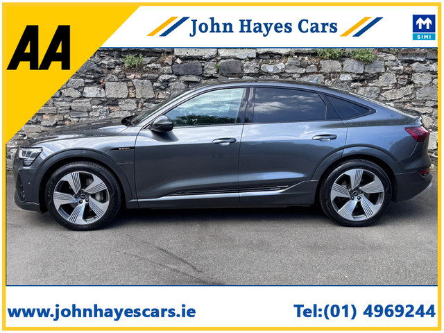 Stunning looking in Datytona Grey with full black leather interior. 2022 Audi ETron 55 Sportback Coupe Quattro 4WD 300kW S LINE 95kWh. Looks fantastic. Fully shadowlined exterior with lovely S Line Alloys. Full Audi Service history. Fully prepared for sale. Fantastic specification. Longer 55 range with fast charge capability and dual side type 2 charging ports. Free HV Battery state of health certificate supplied. 12 month platinum warranty. To arrange an appointment to view please contact 0879068112 or [email protected] thank you. daytime running high performance headlights, Cruise control, Audi sports comfort S Line multi function steering wheel, keyless go, reverse camera with full front and rear park assist, S Line embossed full leather heated seating, Apple Carplay and Android Auto, Multi phone bluetooth, USB and USC connect with full media play, Eextendable knee supports, adjustable lumbar support, Audi Tech pack with fully digital dash, electric open/close tailgate, folding exterior door mirrors. Free car history report supplied for complete peace of mind. John Hayes Cars, a tried and trusted SIMI dealer since 1985.