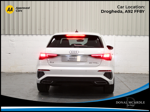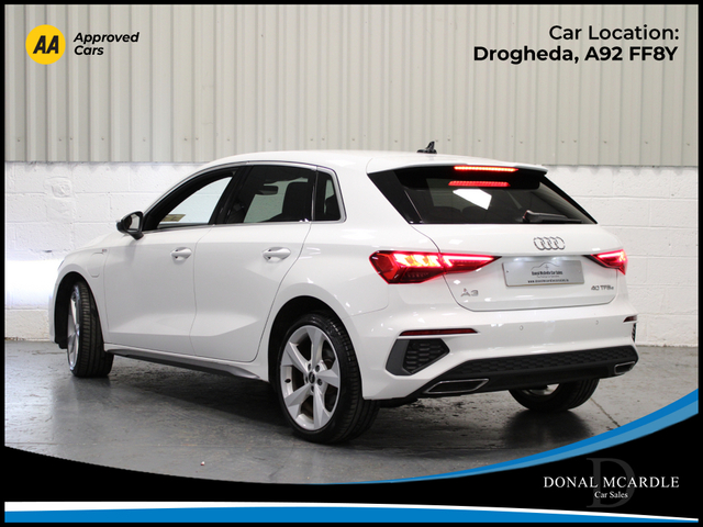 his 2024 Audi A3 Sportback TFSI e S Line is a premium plug-in hybrid that perfectly blends performance, efficiency, and modern styling. With only 11,643 km on the clock, this vehicle is presented in exceptional condition and offers all the benefits of near-new driving. Powered by Audis advanced TFSI e plug-in hybrid technology, this A3 delivers impressive fuel economy along with smooth, responsive performance ideal for both city commuting and longer motorway journeys. The Sportback design provides practicality without compromising on style, while the S Line trim adds a dynamic edge with sport-inspired styling and a refined interior finish. Inside, youll find a high-quality cabin with Audis signature modern dashboard layout, premium materials, and advanced driver-focused technology, ensuring maximum comfort and convenience on every journey. A perfect choice for anyone seeking a stylish, economical and performance-focused hatchback with the added benefit of hybrid efficiency. For more details and to organise a test drive or any other questions please give Barry a call on 0879137581 we are always happy to help in any way that we can!!! At Donal McArdle Car Sales you can buy with confidence, with over 20 years experience in the motor trade we have built up a superb reputation for high quality cars and first class customer service. All our AA Approved Cars come with a 1YEAR AA Membership with full roadside assistance, 101 point inspection. We can source any car, colour or spec you desire. All our cars come VRT Paid on irish plates with a cartel report and will be delivered to you with a comprehensive warranty. For out of hours please call Barry on 0879137581. Finance arranged! We are an authorised credit intermediary for AIB Finance, Close Brothers, First Auto Finance and Bluestone finance. Call Barry on 0419844221/0879137581 to arrange a test drive today. Opening hours Mon Fri 9am 530pm. Sat 10am 3pm. Viewing anytime by appointment. Features Air Conditioning, Alloy Wheels, Anti-Theft System, Automatic Wipers, Bluetooth, Brake Assist System, Central Locking, Centre Armrest, Climate Control, Cruise Control, Daytime Running Lights, Dual Zone Climate Control, Electric Seats, Electric Windows, Electronic handbrake, Folding rear seats, Hill-Start Assist, Multi-Function Steering Wheel, Parking Sensors, Privacy Glass, Rear Spoiler, Remote Central Locking, Sat Nav, Selectable Drive Mode, Six speed transmission, Sports Seats, Stop/Start Button, Traction Control Central Locking, Electric Windows, Airbag, Cruise Control, Rear Spoiler, Privacy Glass, Centre Armrest, Multi-function steering wheel, Satellite Navigation, Traction Control, Metallic Paint, Anti-Theft System, Parking Sensors, Bluetooth, Isofix, Apple Car Play, Android Auto, Active Safety Braking / City Brake / Collision Alert, Stop/Start Button, External Devices Connectivity, Cup holders, Stability control
