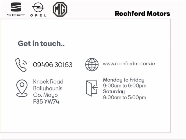 | Contact info: | Rochford Motors Ltd Knock Road Ballyhaunis County Mayo Ph: 094-9630163 |