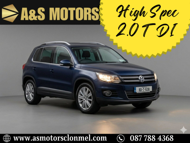 Welcome to A&S MOTORS LTD Car Sales 2016 Volkswagen Tiguan 2.0 TDI SPORT NCT 05/25 Tax 06/26 Low Mileage: 244k km or 151k miles OIL SERVICE DONE ?????????????????? Spec: ?Reversing Camera ?Parking Sensors ?Panoramic Roof ?Alloys Wheels 18ich ?Xenon Lights ?Heated Seats ?Radio/Cd ?Dual Zone Air Condition ?Multi-Function Sterling Wheel ? Start Stop System ?Full Leather Seats ?Electric Windows and Mirrors ? Cruise control ? Auto Lights and Wipers ? Bluetooth Phone and Media Player and many many more . PRICE €12,995 TRADE IN WELCOME FINANCE AVAILABLE ?????????????????? We offer some of the most competitive deals for cars in a range of and models, we are confident that we can find the right car for you. Only with us, you may buy a car of dream in trade price. Don't wait and choose your best deal for your new car with us. Air conditioning, Climate control, Dual zone climate control, Armrest, Keyless entry, Electrically adjustable seats, Electric side mirrors, Electric windows, Electric handbrake, Heated seats, Lumbar support, Multi-function steering wheel, Rain sensor, Spare tyre, Bluetooth, CD, 12v power outlet, Radio, Cruise control, Hill hold assist, Front parking sensors, Rear parking sensors, Remote boot release, Roof rails, Start-stop system, Parking assistance, Alloy wheels, Leather interior, Leather steering wheel, Sports seats, Tinted windows, Auto lights (dusk sensor), Daytime running lights, ABS, Anti collision system, Emergency brake assist, Central locking, Remote central locking, Driver-side airbag, Immobilizer, Isofix, Tyre pressure monitor, Passenger-side airbag, Seat belt warning, Side airbag, Stability control, Traction control