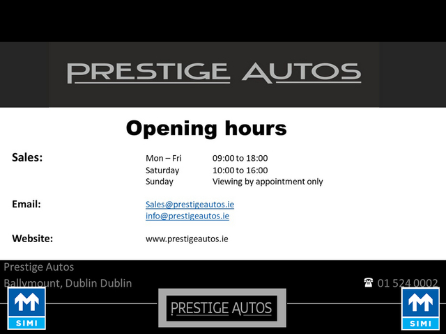 Welcome to Prestige Autos Ballymount established in 2016. We are an AA & SIMI Approved Dealership. We are one of Irelands leading providers of quality used cars with over 15 years experience in car sales , We strive to be the best. All of our vehicles come fully serviced NCT tested fully valeted and most importantly history & finance checked. All of our vehicles also comes with a 3 month warranty as standard with the option to extend, the extension options range from 12 to 24 Months. We also offer Nationwide delivery on all vehicles. For further details contact our sales team sales@prestigeautos. ie 01 524 0002 0861771313 Or visit us for a test drive.