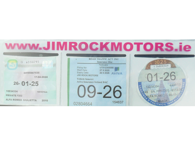 ALFA ROMEO GIULIETTA 1.4 LUSSO.......NCT 01/27.......TAXED 02/26........SERVICE HISTORY.......REMOTE CENTRAL LOCKING......2 KEYS........ELECTRIC WINDOWS AND MIRRORS.......ALLOY WHEELS......FOG LIGHTS.......CD/RADIO.......BLUETOOTH......6-SPEED GEARBOX.......TINTED WINDOWS.........WWW.JIMROCKMOTORS.IE Perfect working order, Price Or Near Offer, 3 Month Warranty, Trade in accepted, Central Locking, CD Player, Immaculate condition, Electric Windows, Airbag, Alloy Wheels, Cruise Control, Electric Mirrors, Fog Lamps, Immobiliser, Rear Spoiler, Privacy Glass, Centre Armrest, Luggage Cover, Multi-function steering wheel, Traction Control, Metallic Paint, Side Impact Protection, Anti-Theft System, Bluetooth, Remote Central Locking, EBD, Folding rear seats, Six speed transmission, Isofix, Active Safety Braking / City Brake / Collision Alert, Stop/Start Button, 2 Keys, Main Dealer Service History, External Devices Connectivity, Cup holders, Remote boot/hatch/rear door release, Stability control