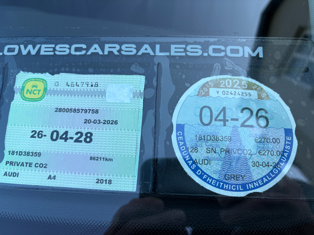 2018 (181) Audi A4 1.4 TFSI 150PS SE Ultra Irish car from new with two owners Nct tested until 04/2028 Taxed until 04/2026 Two remote keys Features - Alloy wheels - Air con - Climate control - Full leather interior - Sat Nav - LED lighting - Cruise control - Multi function steering wheel - Parking sensors - Audi MMI - Aux / USB - Bluetooth - Auto lights and wipers - ISOfix Supplied fully serviced complete with warranty and full vehicle history report Finance available - apply online on www.lowescarsales.com Contact us for more details on 087 4491387