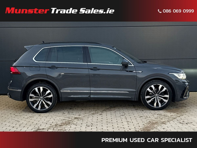 2021 Volkswagen Tiguan 2.0 TDI R-Line Dolphin Grey | 20” Alloys | Digital Cockpit A sharp and highly specified Tiguan R-Line finished in Dolphin Grey Metallic, combining sporty styling, modern technology and everyday practicality. Powered by a 2.0 TDI (110kW) with 6-speed manual, offering smooth performance and excellent fuel efficiency. Key Highlights R-Line Styling Package 20” Suzuka Alloy Wheels Digital Cockpit Pro LED Matrix Headlights (IQ Light) Keyless Entry & Start Heated Front Seats Rear Privacy Glass Technology Discover Media Navigation Apple CarPlay & Android Auto (Wireless) Voice Control & DAB Radio Driver Assistance Adaptive Cruise Control Travel Assist Lane Assist & Blind Spot Monitoring Rear Camera + Parking Sensors Comfort 3-Zone Climate Control Ambient Lighting Premium Comfort Seats Sliding Rear Bench Condition Fully Serviced Fully Inspected Excellent Condition Throughout Munster Trade Sales, Limerick Call or message today to arrange a viewing • Full vehicle Service & inspection • Professionally valeted & Detailed • Car History Checked • Finance Available