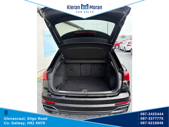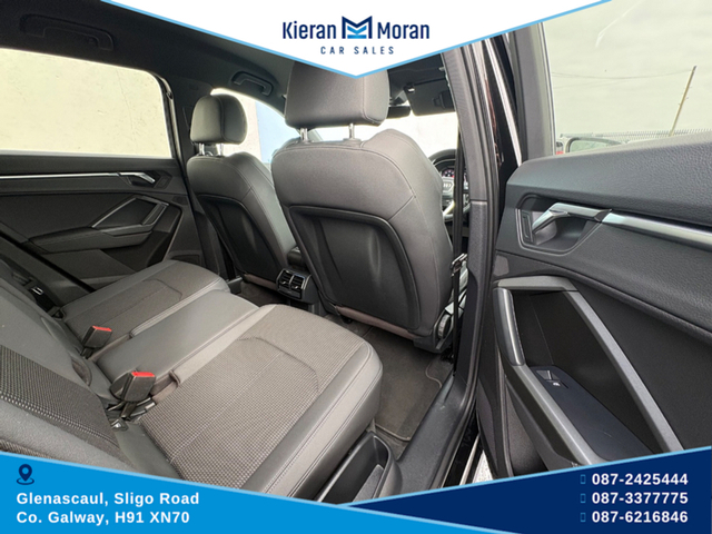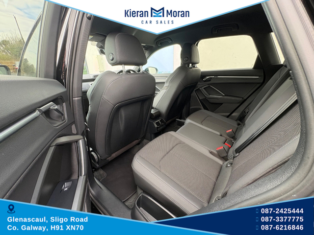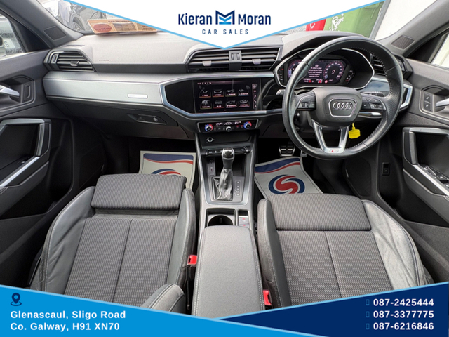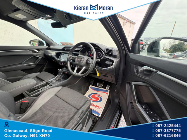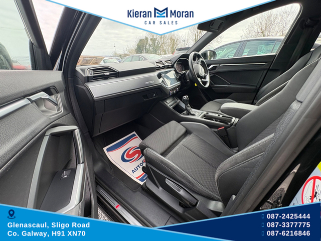 One Owner Car!!!!!! Stunning Audi Q3 S-line Automatic in stock and now for sale. This beautiful car offers top class comfort, style and reliability with economical performance and build quality that Audi is known for. Finished in Swartz Black with 19" Audi Alloy Wheels, this car comes with an Automatic Gearbox, Parking Sensors, Electric Mirrors, Electric Windows Darkened Rear Windows, Roof Rails and Front Foglights. Features Inside Include Full S-line Interior Half Black Leather/Alcantara Interior S-LINE Steering Wheel Multifunction Steering Wheel Bluetooth Media Cruise Control Speed Limiter Full LED Dash Display Multiple Dash Display Options Adjustable Steering Column Full LED Touch Screen Centre Console Apple CarPlay AndroidAuto Bluetooth Media AM/FM/DAB Radio USB/USBC Slots Auto Air-Conditioning Dual Zone Control Driving Mode Selection Traction Control Settings Auto Stop/Start Function Hill Decsent Assist Auto Hold Function 12v Plugs Adjustable Centre Armrest Isofix Rear Seats Rear Centre Armrest Spacious Boot Area Privacy Boot Cover This car is in immaculate condition both inside and outside, driving smoothly and solid along the road and now available to test drive. A must see car to appreciate. For more information and all our stock visit www.kieranmorancars.ie Or Call 0872425444 0873377775 0866216846 3 Month Warranty, Central Locking, Electric Windows, Airbag, Cruise Control, Rear Spoiler, Centre Armrest, Multi-function steering wheel, Traction Control, Metallic Paint, Parking Sensors, Bluetooth, EBD, Isofix, Apple Car Play, Android Auto, Active Safety Braking / City Brake / Collision Alert, Stop/Start Button, External Devices Connectivity, Cup holders, Remote boot/hatch/rear door release, Stability control