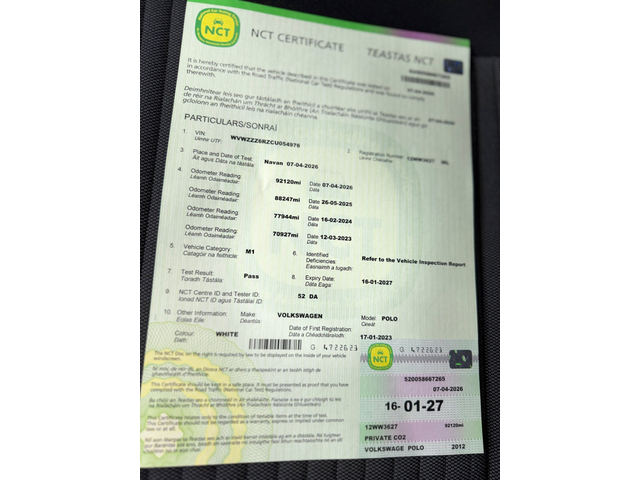 Volkswagen Polo 1.2 diesel New Nct 01/27 Tax 31/07/2026 92120 miles Manual Clean Very economical car Low tax Low insurance Service history 3 months warranty More info call 0877016546 Spare tyre, Hill hold assist, Alloy wheels, Leather steering wheel, Tinted windows, Daytime running lights, LED headlights, Emergency brake assist, Remote central locking, Immobilizer, Isofix